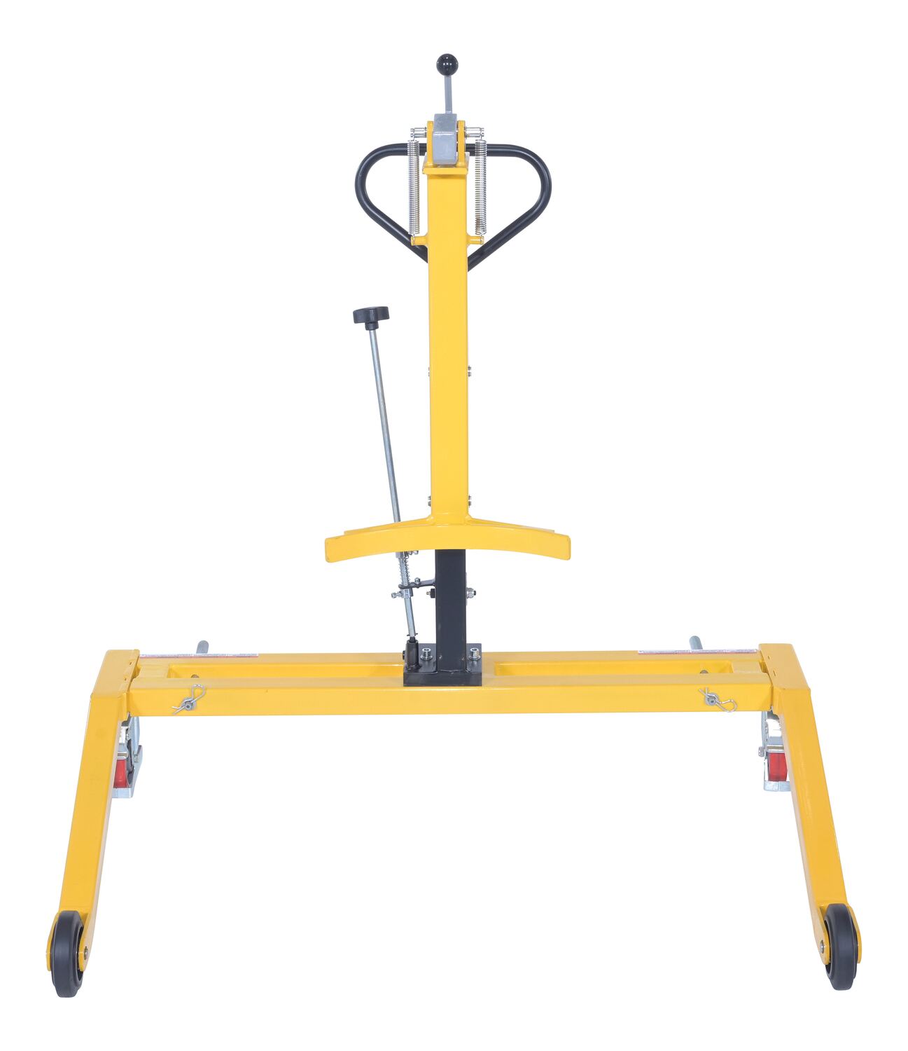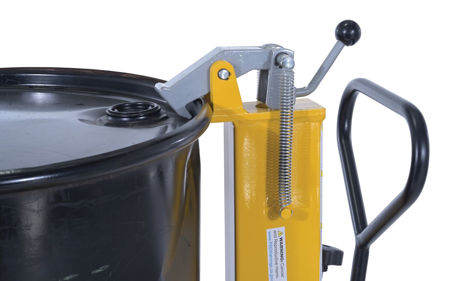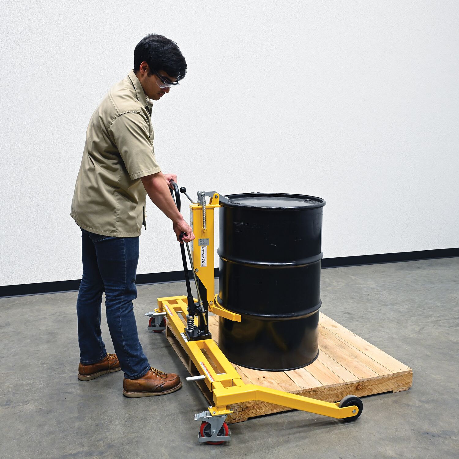 Steel Pallet Straddling Drum Truck 46 In. Long x 32 In. Wide x 47 In. Height 550 Lb. Capacity YellowA single operator can engage, lift and transport drums stored either on the center of pallets or the corner of containment skids with this pallet straddling drum truck. Works with steel drums. To engage a drum, the truck uses a rim clamp that securely grasps the top lip of the drum. Wheels provide a high degree of maneuverability; each swivel wheel is protected by guards and is equipped with brakes.