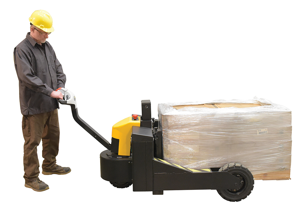 Steel Rough Terrain Electric Pallet Truck DC Powered AC Drive Motor 24 In. Inside Width 3000 Lb. Capacity Black / YellowAn all-terrain pallet truck is the perfect outfit for moving heavy loads over a variety of landscapes. The simple functionality of the unit allows the user to maneuver the truck, both loaded and loaded, easily. Driving handle is centrally located and other functions, such as horn, are placed just underneath the handle on the front console of the unit. Forks are adjustable to best fit the users needs.