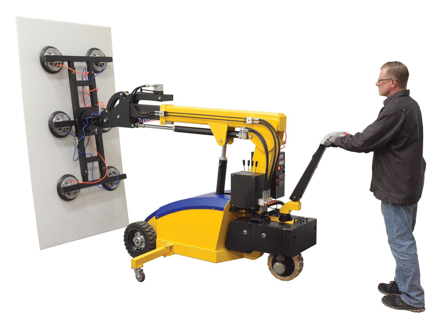 Steel Rough Terrain Vacuum Move Lifter with 6 Suction Cups 1200 Lb. Capacity Black / YellowA vacuum material lift is a great way to safely transfer large items. With the six suction cups widely spaced the lifter can be positioned in a variety of ways to best be utilized. An ergonomic walk behind steering handle allows the user to have quick maneuverability. Vacuum controls are placed at the rear of the unit to give the user complete visibility of the unit and of the item being positioned. Vacuum lifting arm is telescoping and adjustable to fit a wide range of areas. Rubber wheels are perfect for minimizing jostling while traversing a variety of surfaces. Powder coated steel construction for built in added toughness.