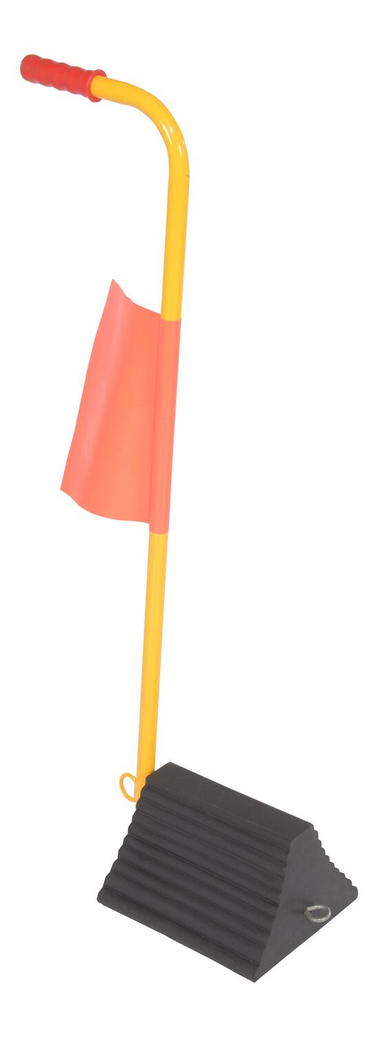 The ergo-handle Wheel Chock has an ergonomic design that makes it easy to move wheel chocks in and out of position under trailer wheels. It reduces the risk of back, knee, and foot injuries. The handle is constructed of steel and has a yellow powder coat finish. Hardware included. Assembly required. D-ring provided for attaching security chain. A vinyl flag is included to provide added visibility and awareness to the chock. Chain not included.