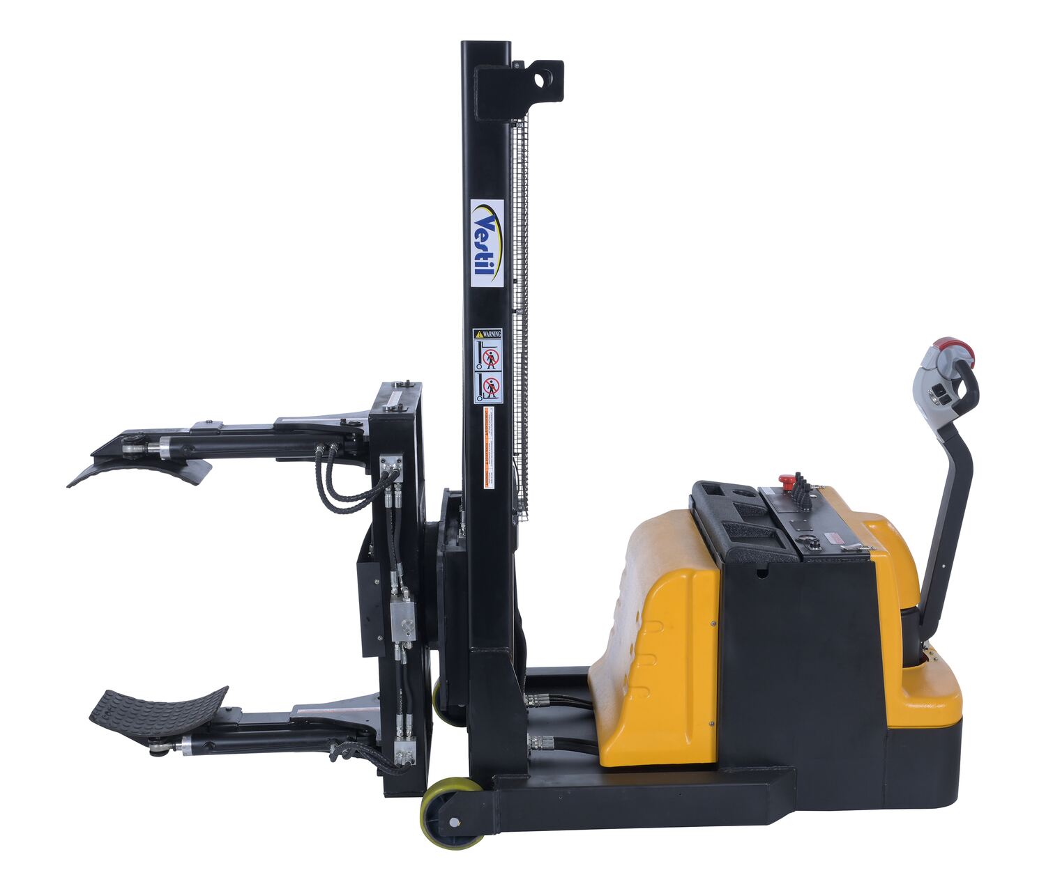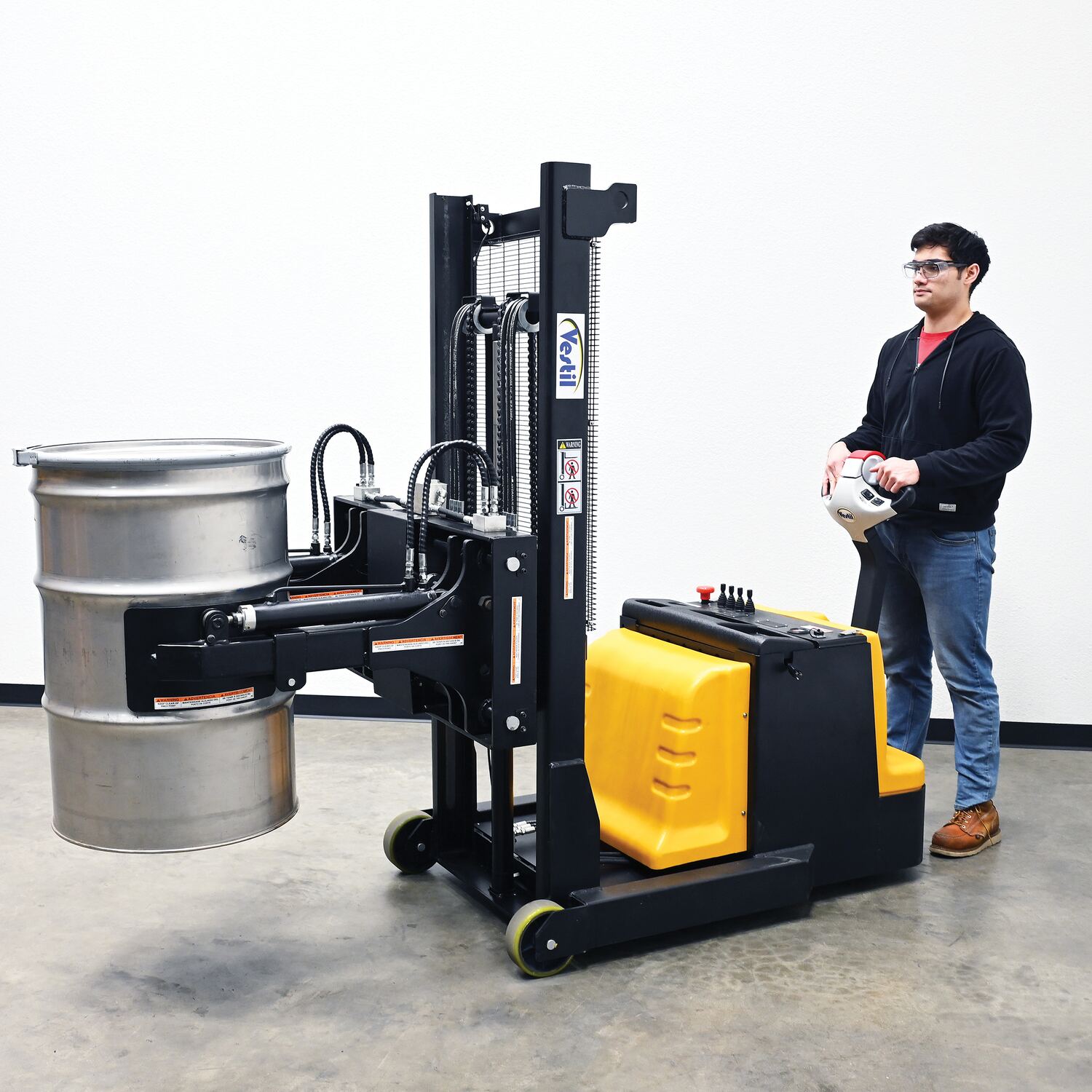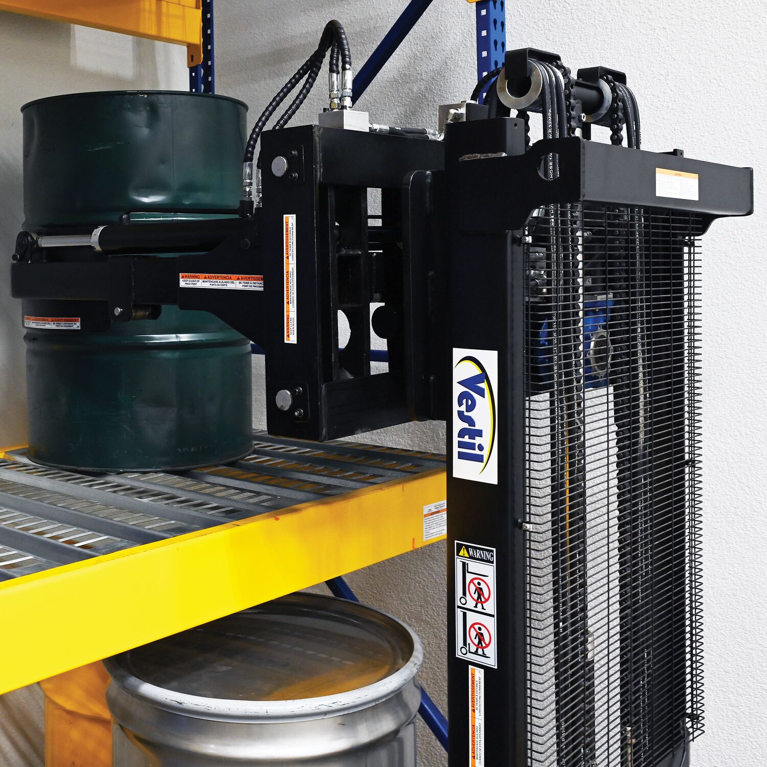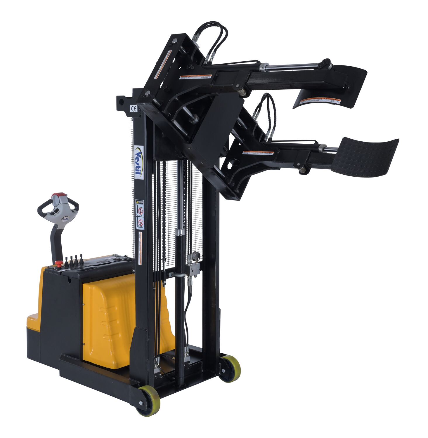 Steel Vertical Drum Gripper/Rotator Stacker With Gripper Max Reach 35.5 In. Dispensing Height 71 In. 800 Lb. Capacity Black / YellowThe fully powered vertical drum gripper/rotator is a great asset for the manufacturing and distributing industries. The shortened length allows for use in very tight areas, while the extendable reach helps load and unload places where access is limited, such as pallets and skids. A walk behind design with a max unloaded speed of over 3 mph and a single handle control makes maneuvering into the desired position easy, maximizing efficiency. Long term battery charge allows for constant daily use without needless downtime.