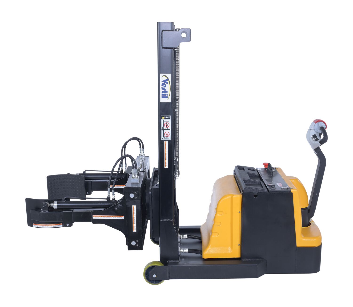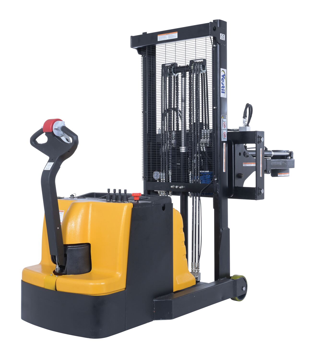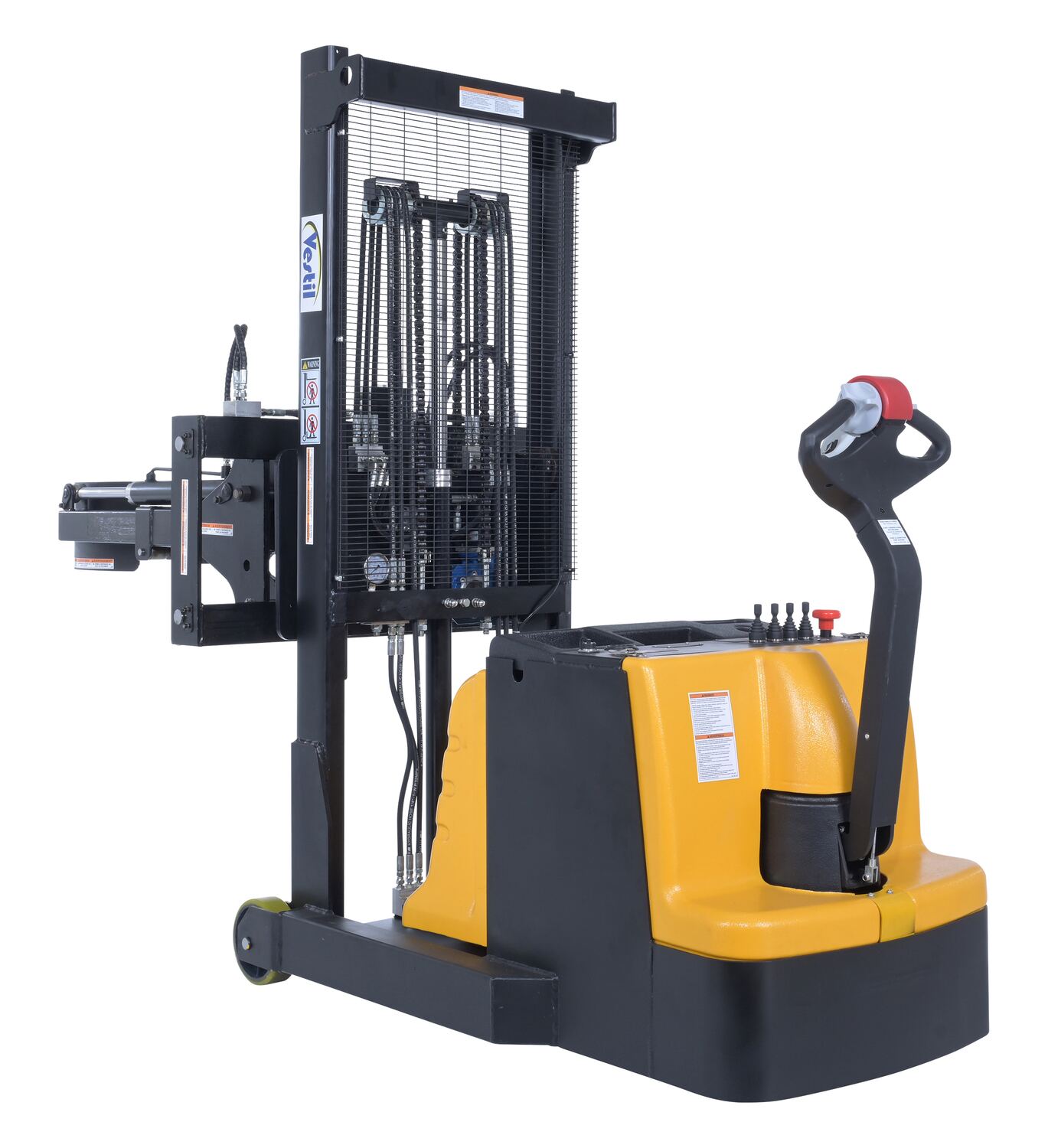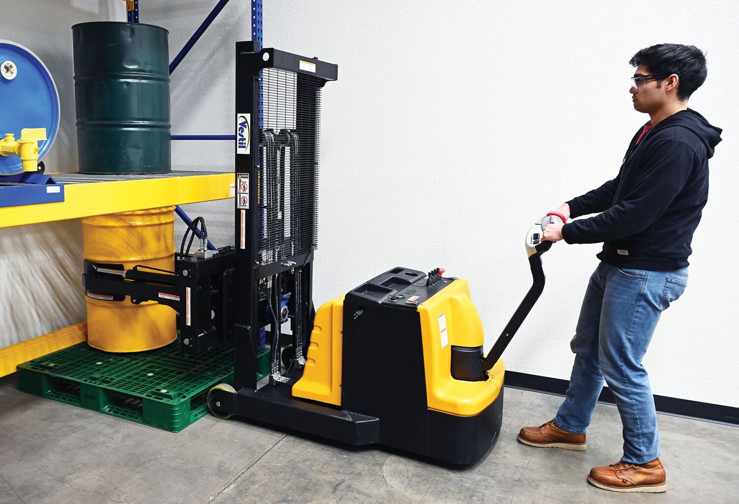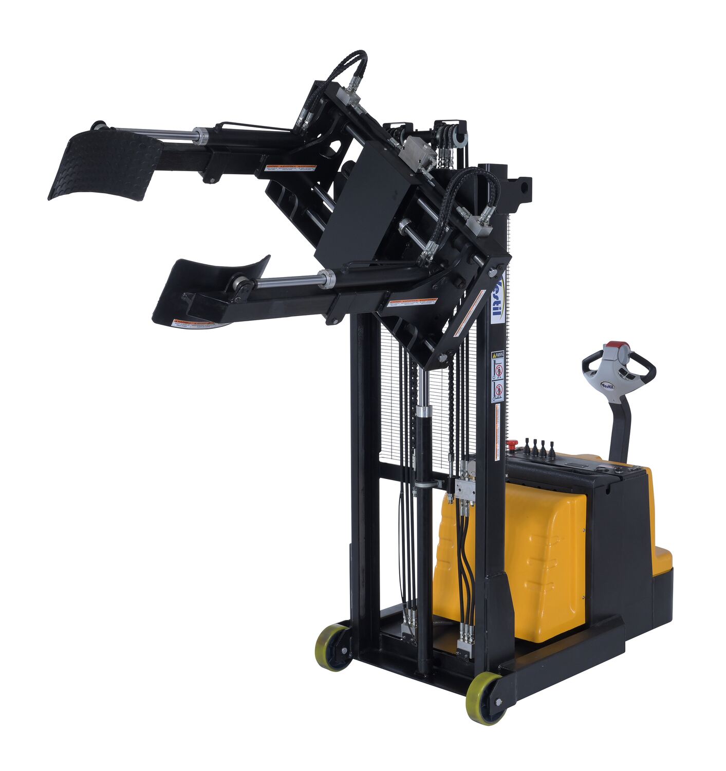 Steel Vertical Drum Gripper/Rotator Stacker With Gripper Max Reach 35.5 In. Dispensing Height 71 In. 800 Lb. Capacity Black / YellowThe fully powered vertical drum gripper/rotator is a great asset for the manufacturing and distributing industries. The shortened length allows for use in very tight areas, while the extendable reach helps load and unload places where access is limited, such as pallets and skids. A walk behind design with a max unloaded speed of over 3 mph and a single handle control makes maneuvering into the desired position easy, maximizing efficiency. Long term battery charge allows for constant daily use without needless downtime.