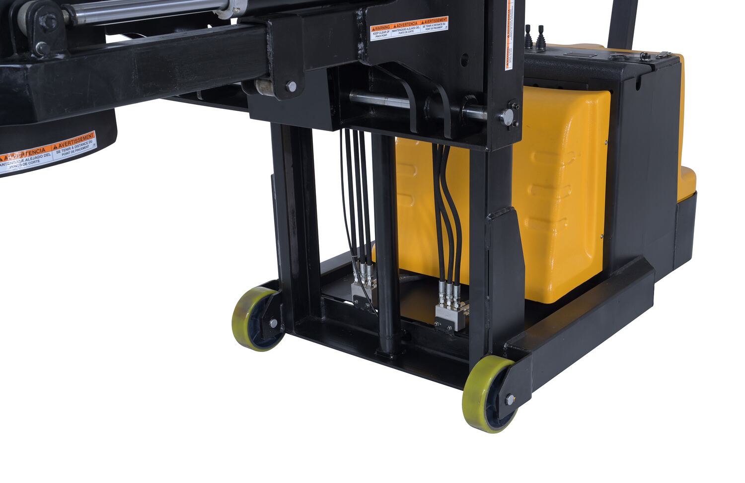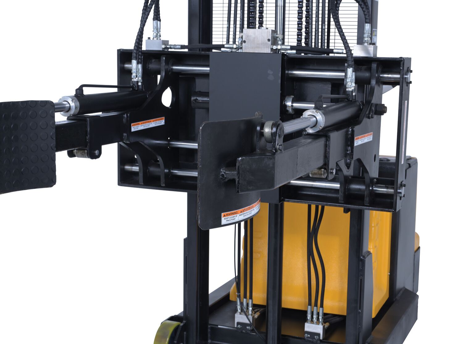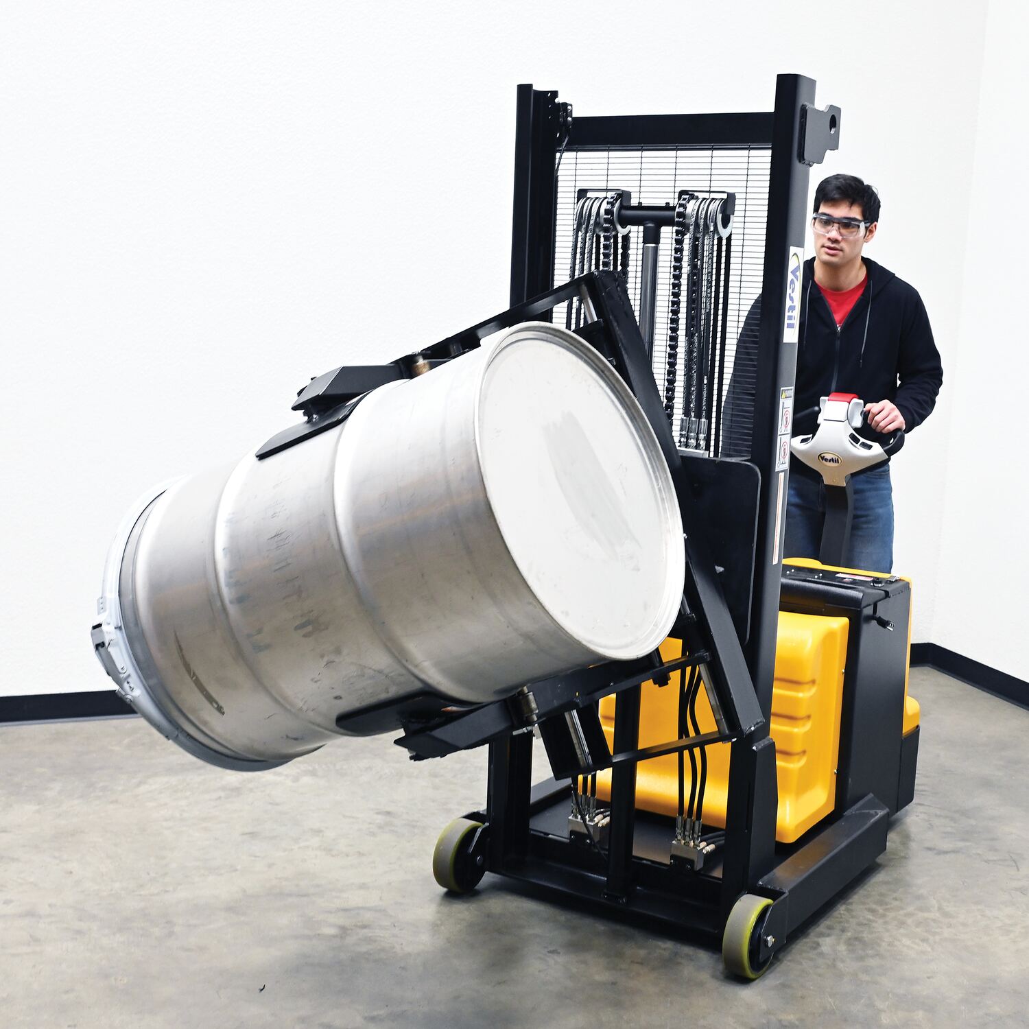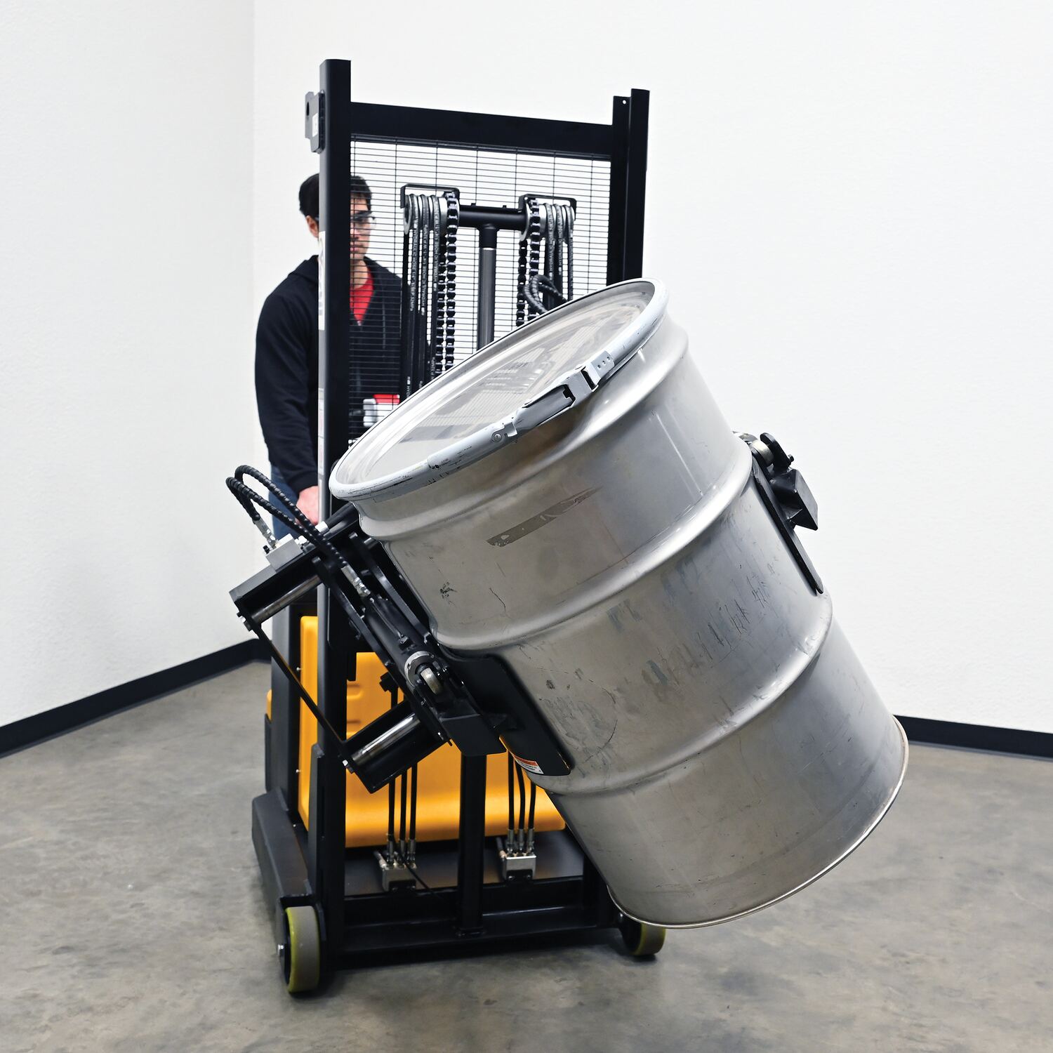 Steel Vertical Drum Gripper/Rotator Stacker With Gripper Max Reach 35.5 In. Dispensing Height 71 In. 800 Lb. Capacity Black / YellowThe fully powered vertical drum gripper/rotator is a great asset for the manufacturing and distributing industries. The shortened length allows for use in very tight areas, while the extendable reach helps load and unload places where access is limited, such as pallets and skids. A walk behind design with a max unloaded speed of over 3 mph and a single handle control makes maneuvering into the desired position easy, maximizing efficiency. Long term battery charge allows for constant daily use without needless downtime.