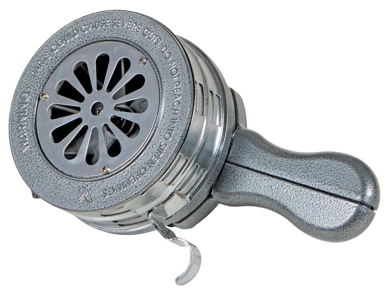 Steel Warning Siren Hand Crank Silver/GrayThis warning siren is an ideal method to warn people of dangerous situations including: severe weather warnings, emergency circumstances, terror situations, military alerts and correctional facility alerts. Easy hand crank operation. Includes a convenient carrying bag.