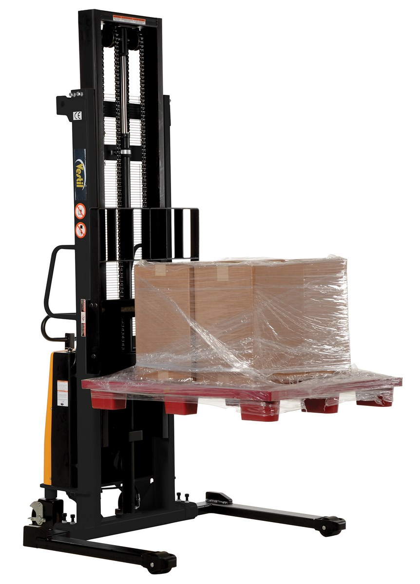 Steel Adjustable Stacker with Powered Lift 137 In. Raised Height 2,000 Lb. Capacity Black / YellowThe stacker powered lift is a semi-electric stacker with a powered lift that will raise and lower loads quickly and easily. The manual push operation stacker is made using high quality material and parts. The stacker is easily maneuvered using the standard pulling handle with adjustable forks and adjustable support legs. The stacker is highly efficient and durable while working with pallets or skids. It features an integral battery charger and battery level gauge.