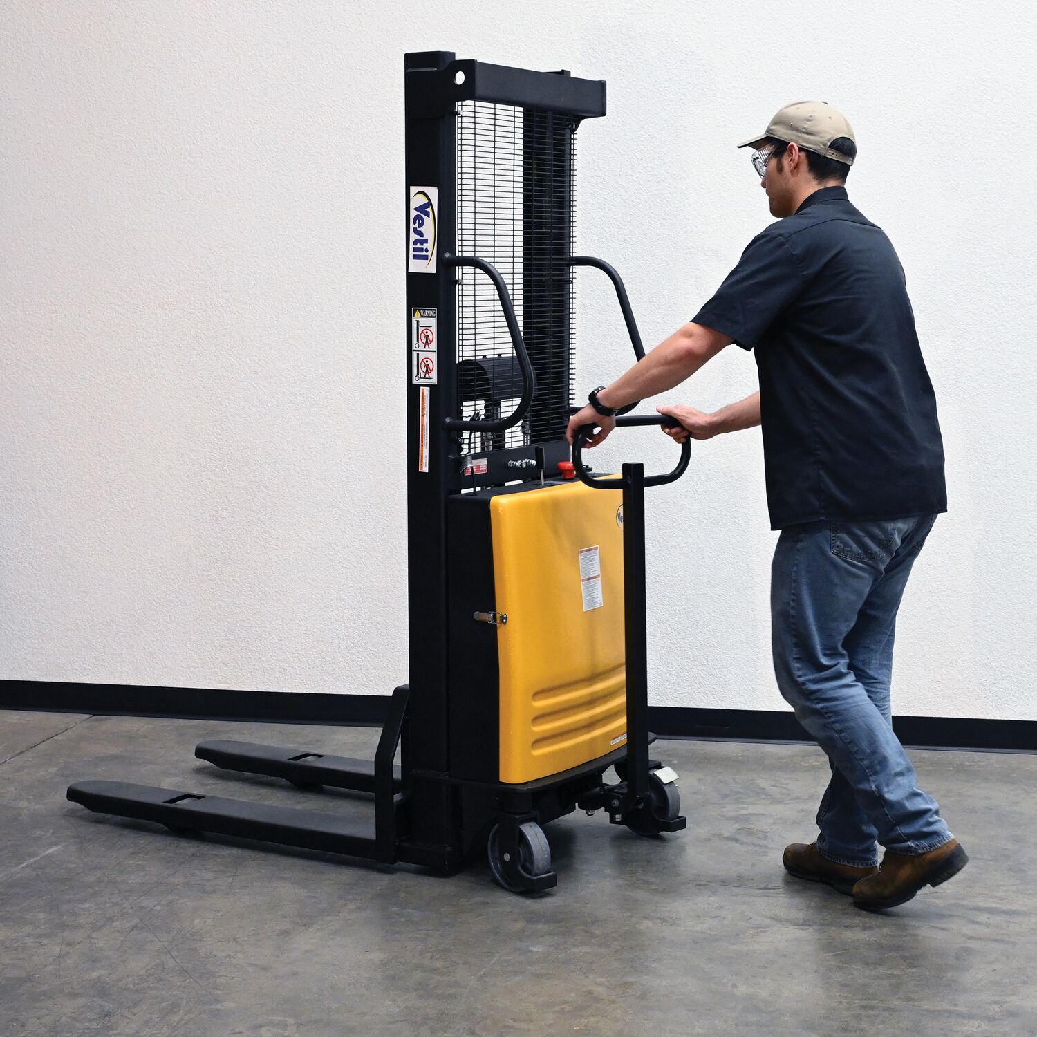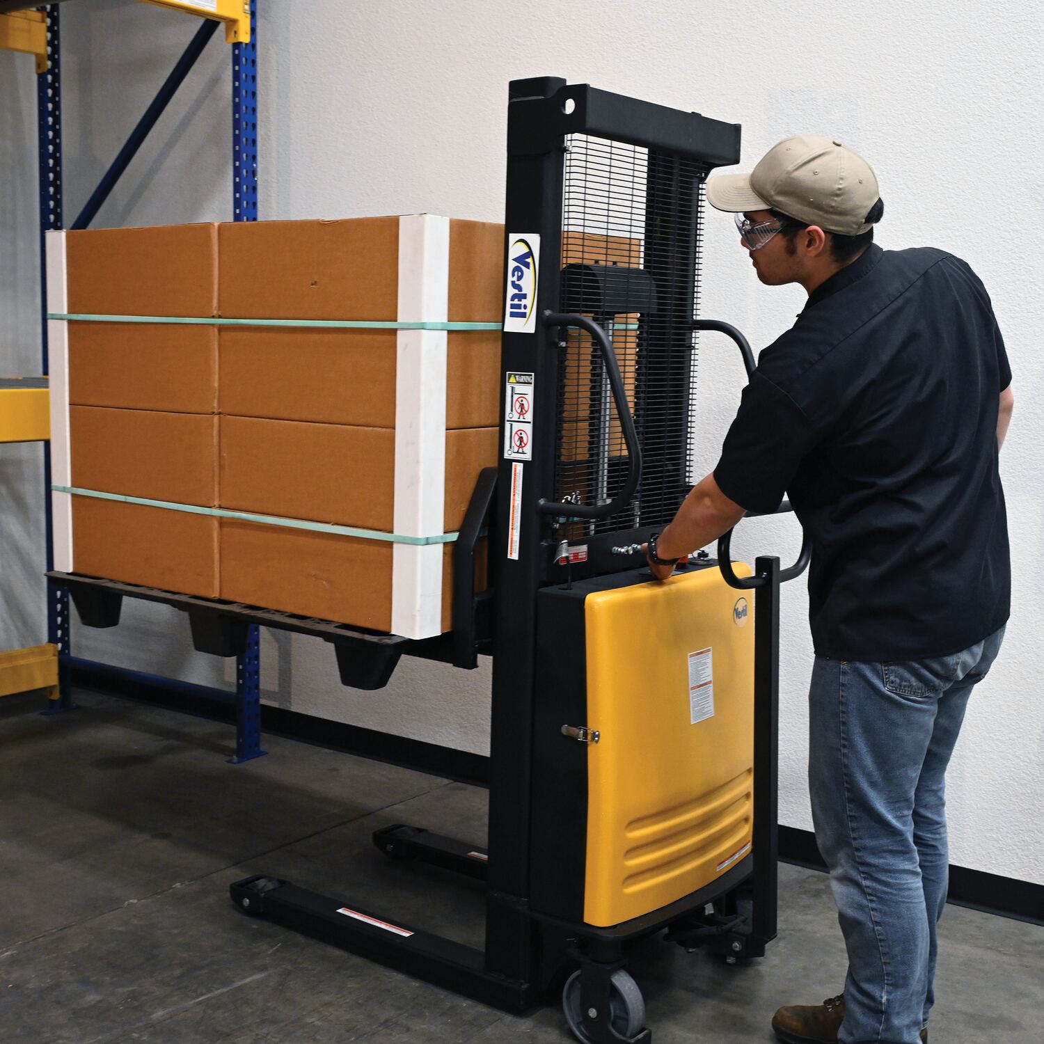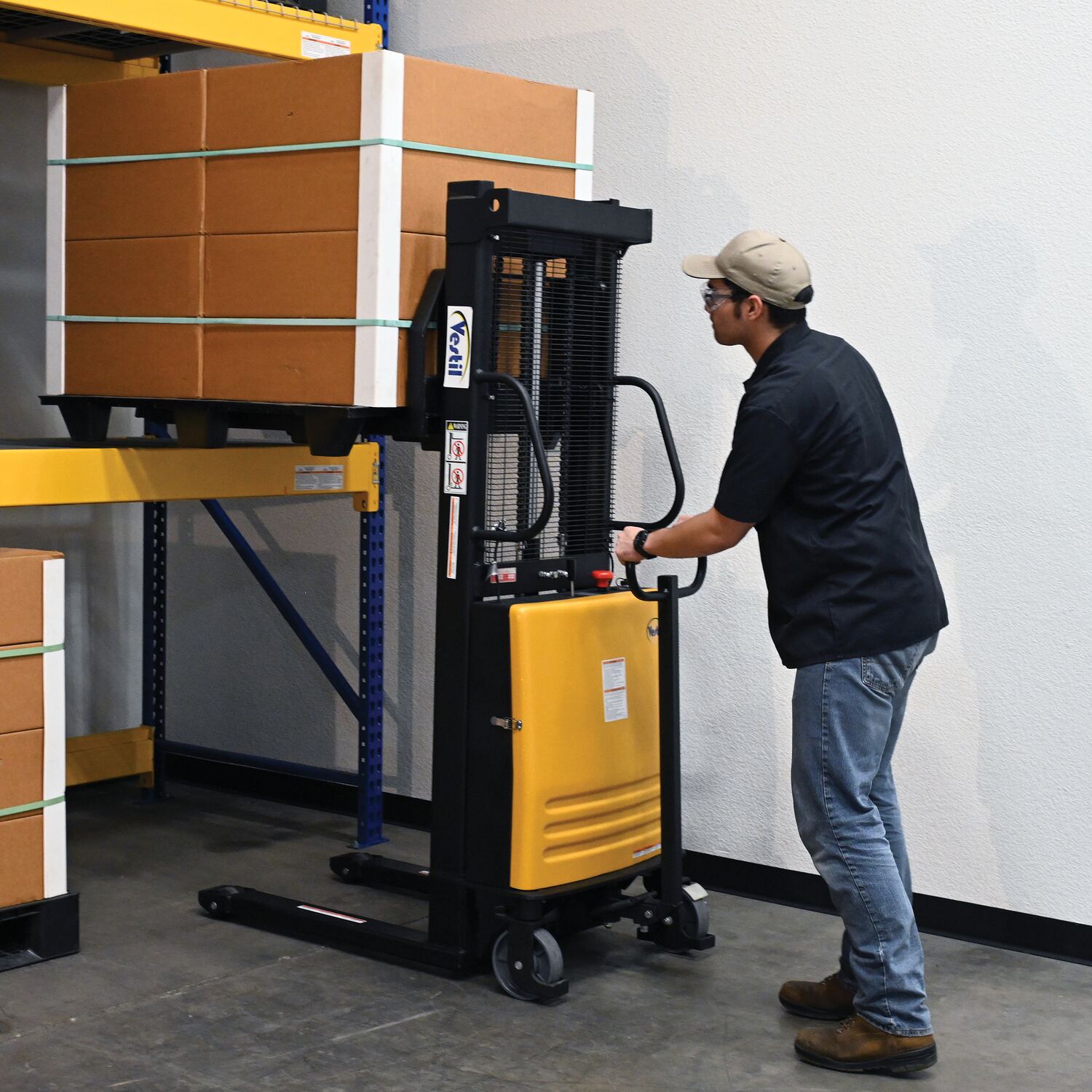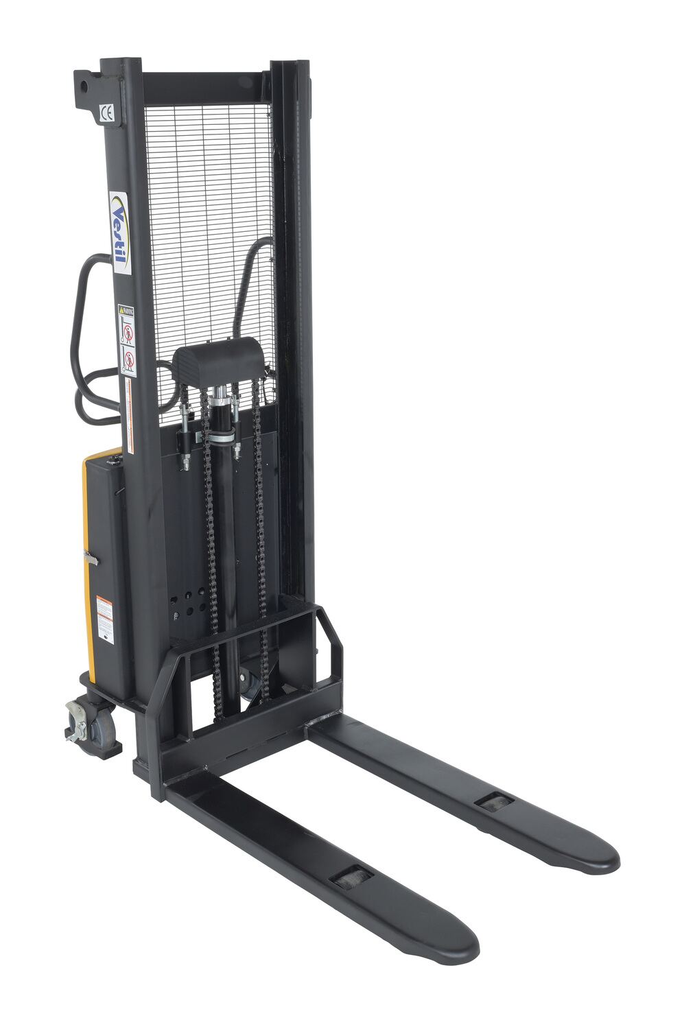 Steel Fixed Stacker with Powered Lift 63 In. Raised Height 2,000 Lb. Capacity YellowThe stacker powered lift is a semi-electric stacker with a powered lift that will raise and lower loads quickly and easily. The manual push operation stacker is made using high quality material and parts. The stacker is easily maneuvered using the standard pulling handle. The stacker is highly efficient and durable. It features an integral battery charger and battery level gauge. The unit works with skids only and features fixed forks along with fixed support legs.