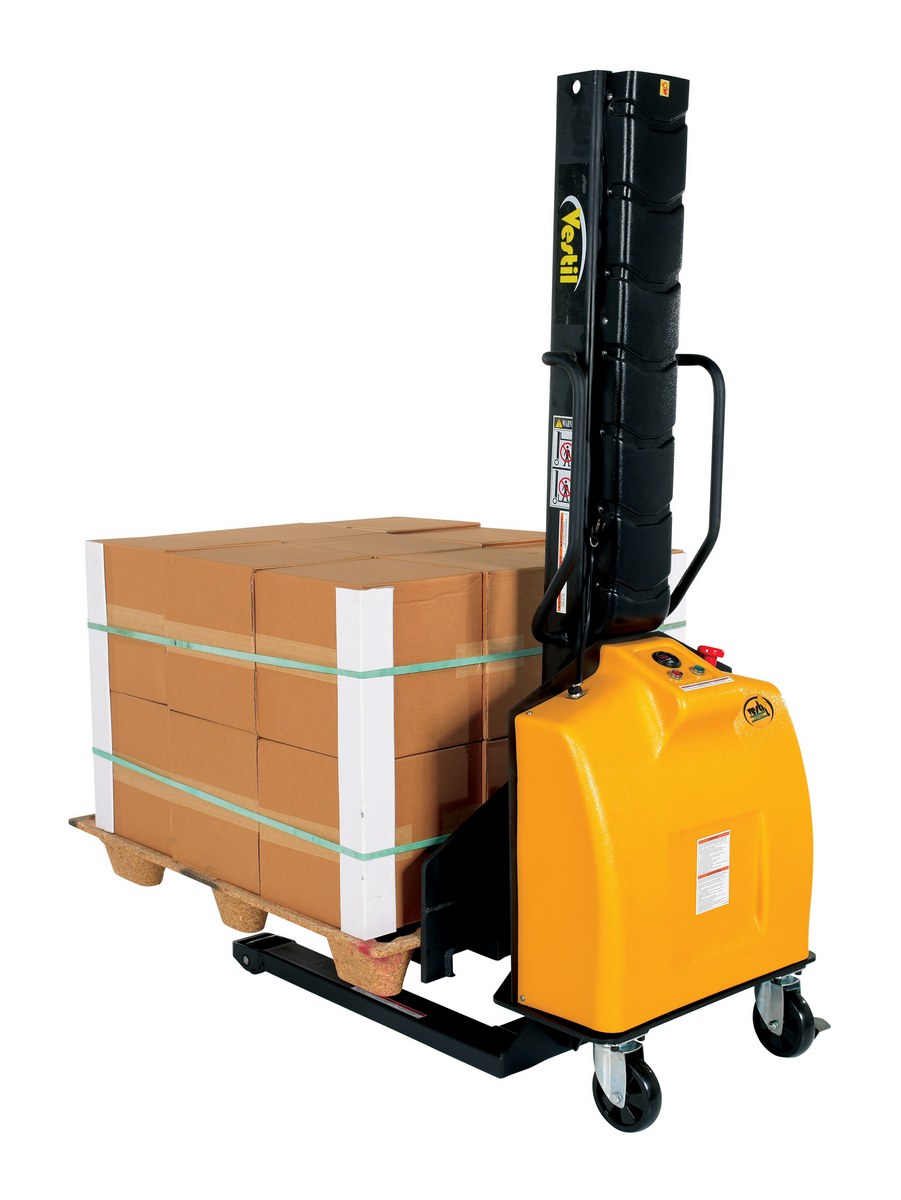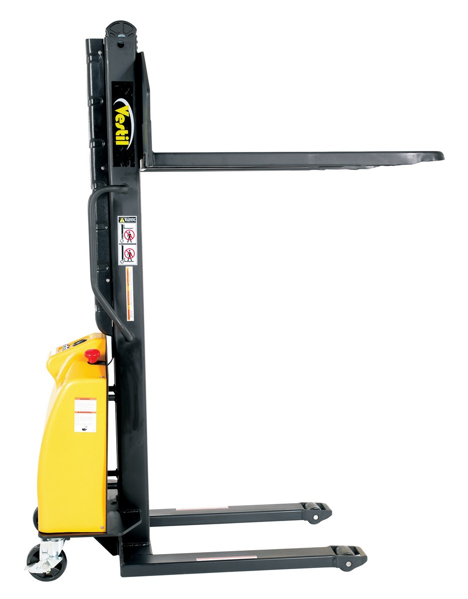 Steel Narrow Mast Stacker DC Powered 63 In. Raised Height Fixed Forks 45-1/4 In. Fork Length 1,500 Lb. Capacity YellowThe narrow mast stacker is great for the shipping and manufacturing facilities. The stacker provides a fast efficient solution to loading and unloading products in closely confined areas. The unit features a simple push button design for lifting control, nylon steering and load wheels for excellent maneuverability, and a battery charger and gauge. Models are available with fixed or adjustable forks as well as fixed or adjustable leg supports.