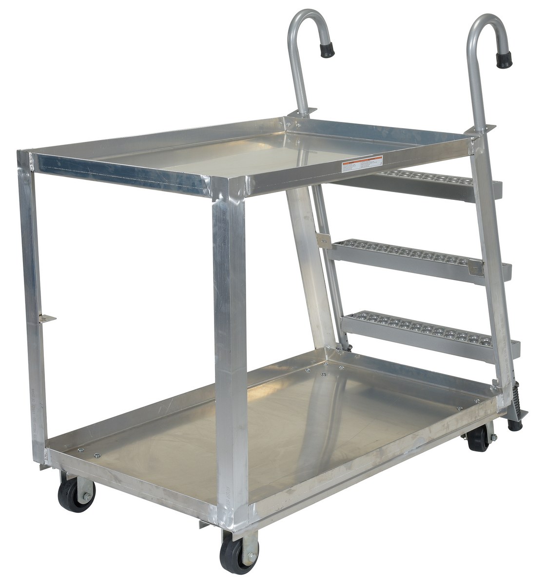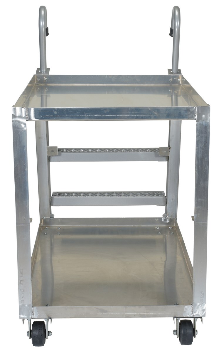 Aluminum Stock Picker with Steel Ladder 52 In. x 27-7/8 In. x 50-3/16 In. 660 Lb. CapacityCombine the mobility of a cart with the versatility of a step ladder with this stock picker truck. Convenient spring loaded steel step ladder holds the cart securely in place while a person is standing on the ladder. Crutch tip ladder prevents the cart from moving while stocking. Springs then return the ladder to the raised position once personnel exit the step. All shelves have the lip turned up to prevent items from falling off. Ladders have a baked in silver powder coated finish.
