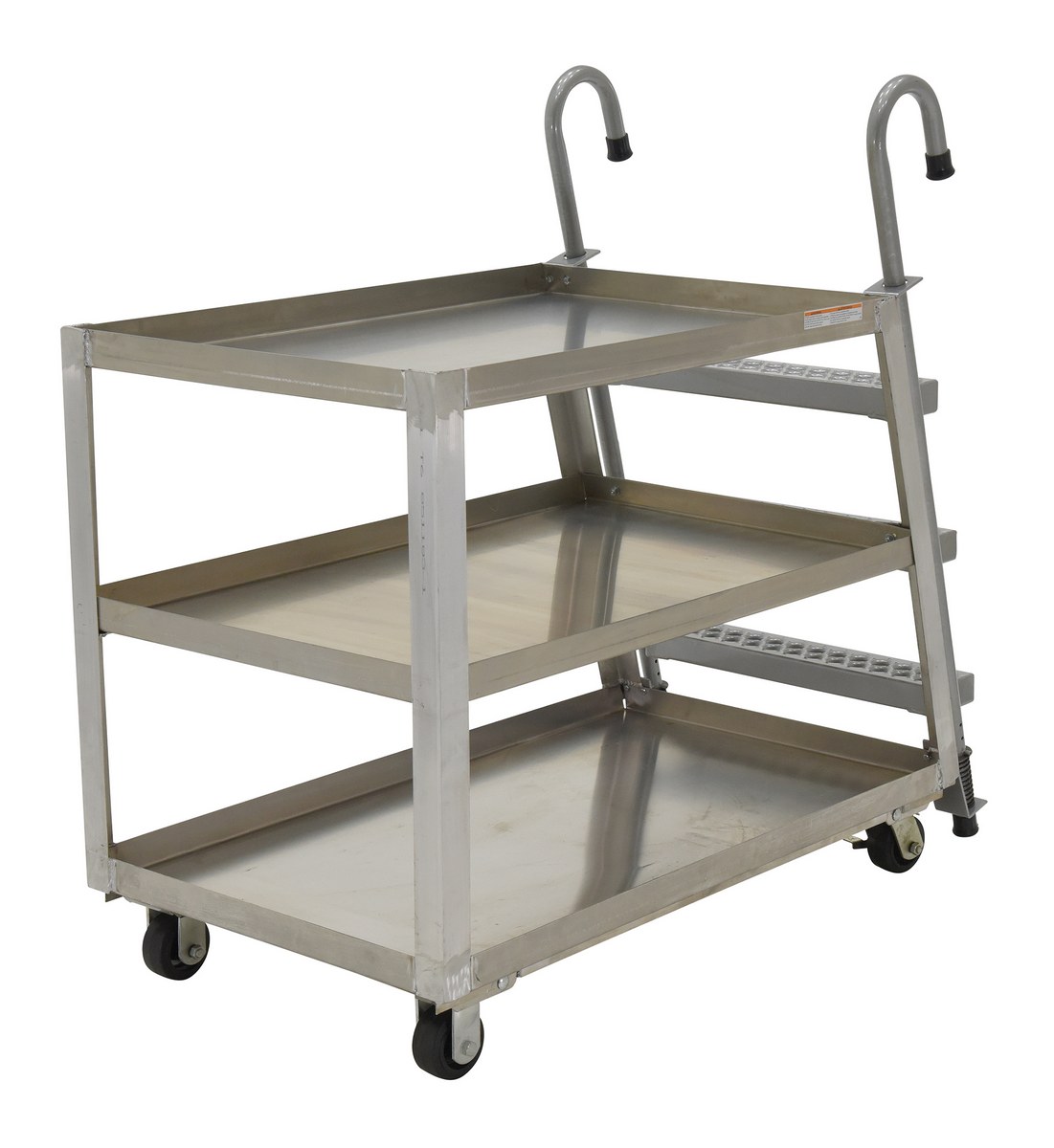 Aluminum Stock Picker with Steel Ladder 52 In. x 27-7/8 In. x 50-3/16 In. 1000 Lb. CapacityCombine the mobility of a cart with the versatility of a step ladder with this stock picker truck. Convenient spring loaded steel step ladder holds the cart securely in place while a person is standing on the ladder. Crutch tip ladder prevents the cart from moving while stocking. Springs then return the ladder to the raised position once personnel exit the step. All shelves have the lip turned up to prevent items from falling off. Ladders have a baked in silver powder coated finish.