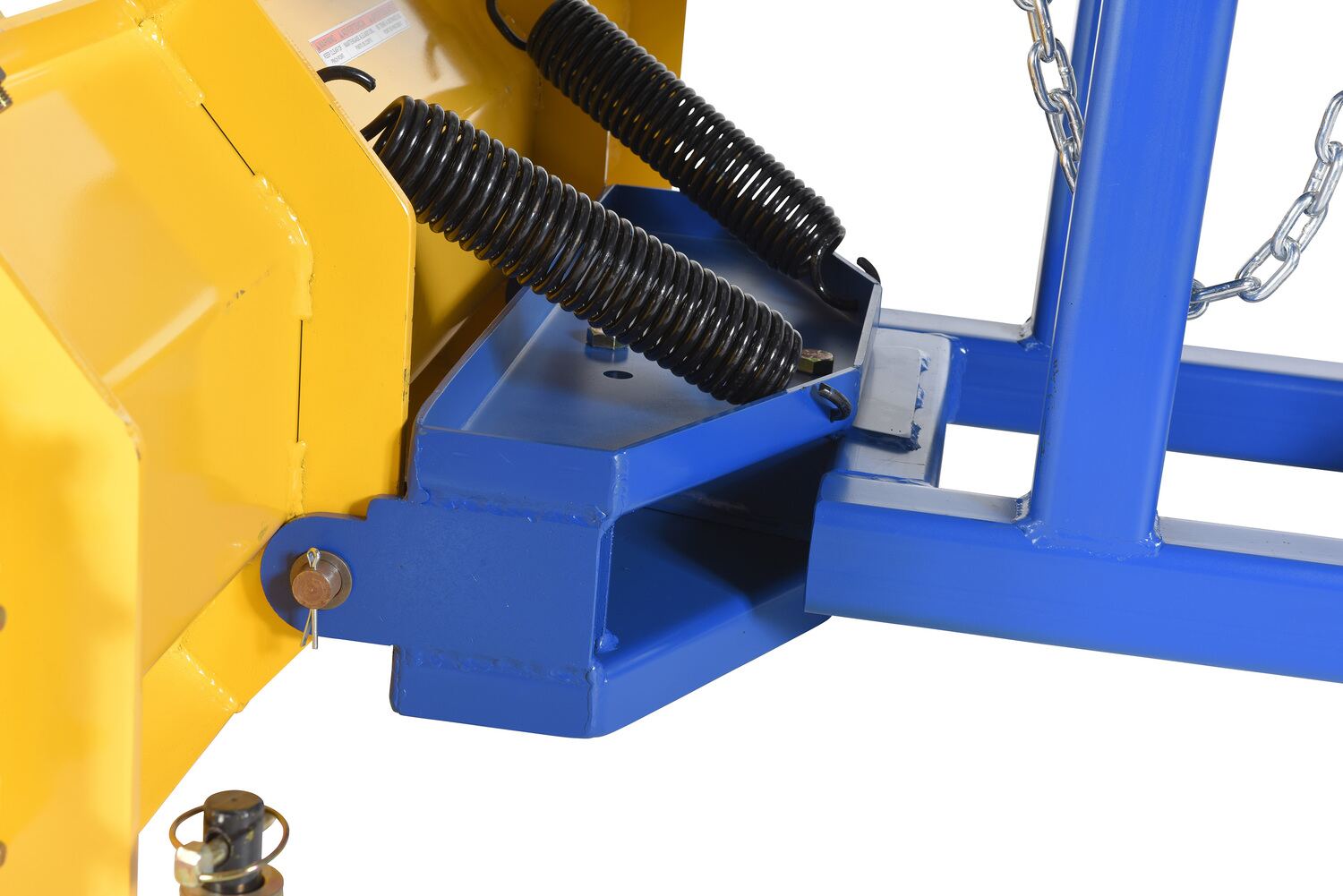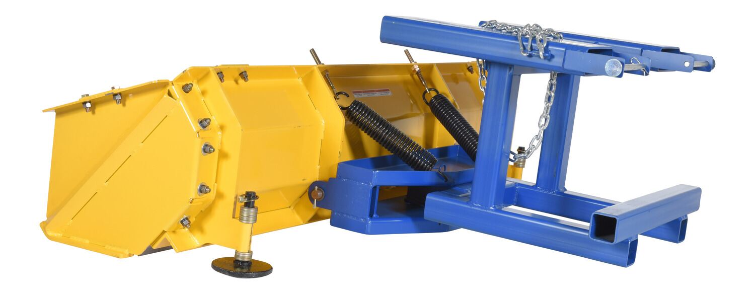 Steel Snow Plow Fork Mounted Push Box 72 In. Blade Width Blue / YellowUnique design attaches to fork truck forks. Pass through fork tubes keep weight back towards fork truck mast. Locking pins secure snow plow to forks for safety. The steel construction has a brightly colored baked-in powder-coated finish for added toughness and clear visibility. The attached sides contain the snow in a direct manner for time and safety efficiency.