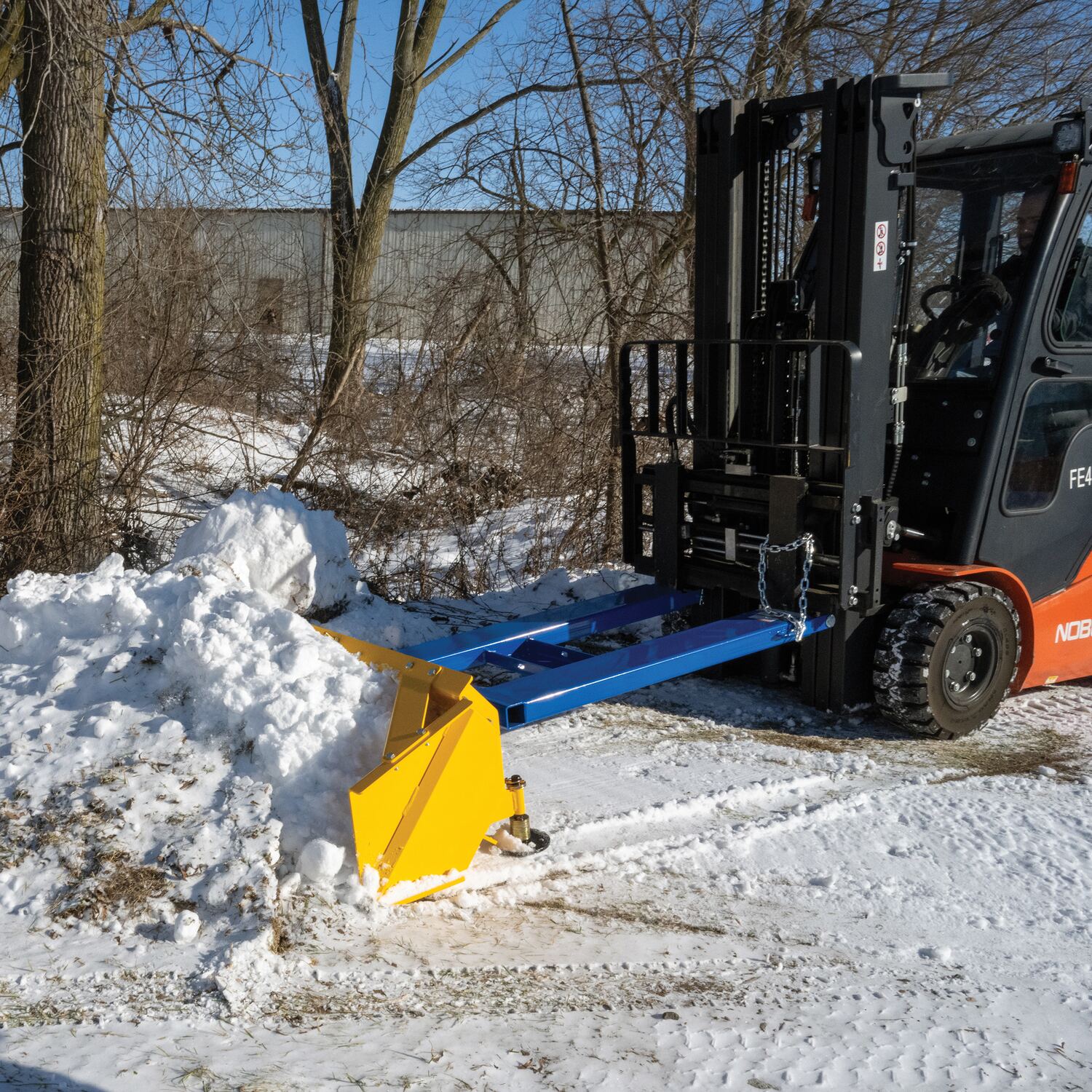 When snow needs moved and removed, look no further than the fork truck snow pusher. The unique design attaches to fork truck forks, so no power supply is needed! With a manual pivot mechanism, blade rotation to both the right and left are simple. Steel construction with baked in powder coat finish for added toughness.