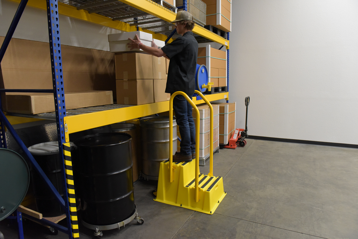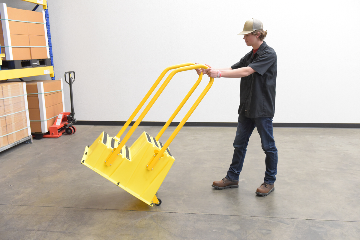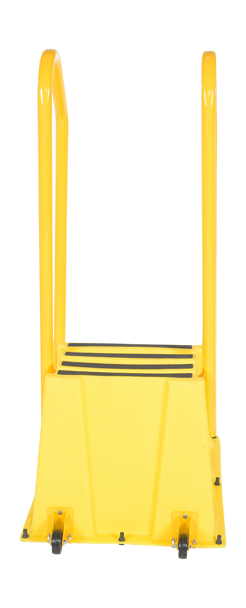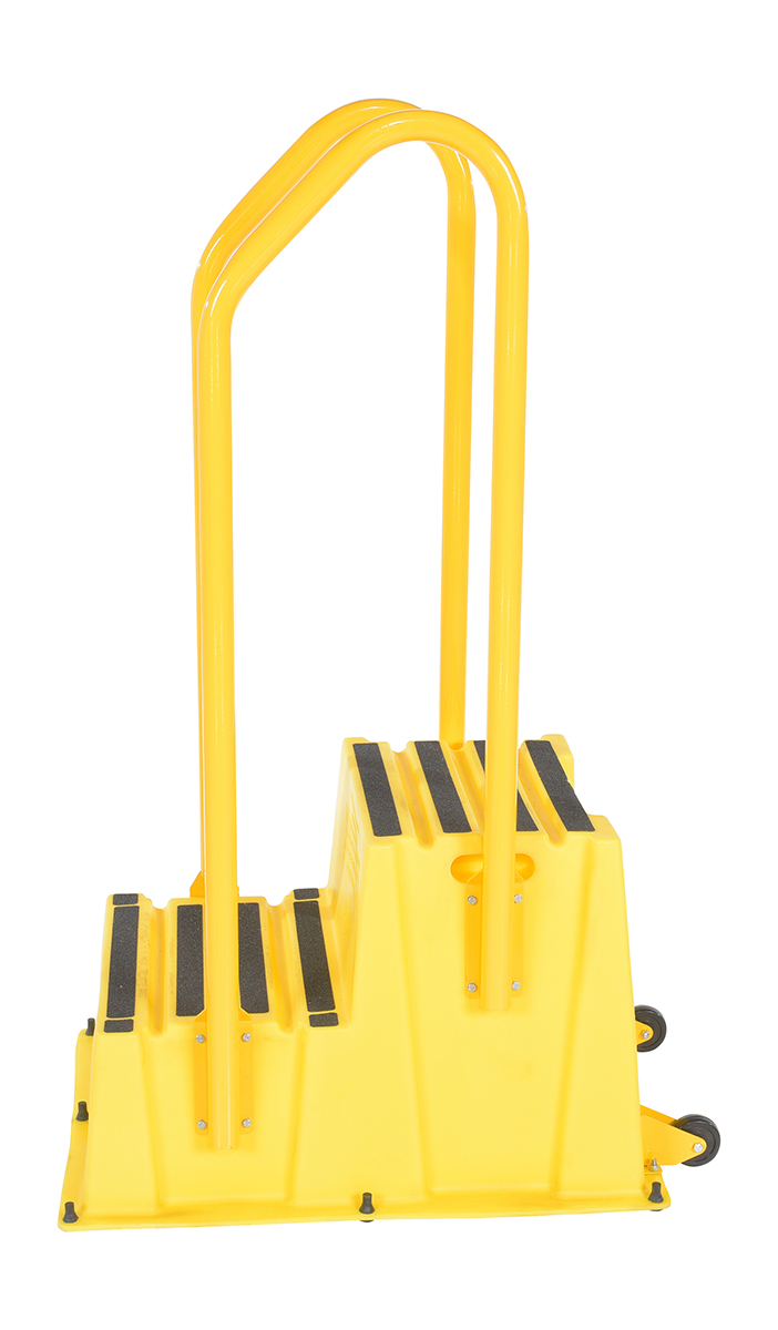 Polyethylene Nestable with Handrails Casters 2 Step 500 Lb. Capacity YellowA poly step stool is a great asset for on the go or in a permanent setting. A lightweight design with front and side cutout handles, allow the user to easily transfer the stool to a preferred spot. The taped step surfaces ensure safe footing while traversing up and down the steps. Includes bolt on handrail and casters. The hand rails height allows the unit to be pushed or pulled into the desired position, minimizing bending and twisting by the user. Steps can be nested to minimize footprint when not in use.