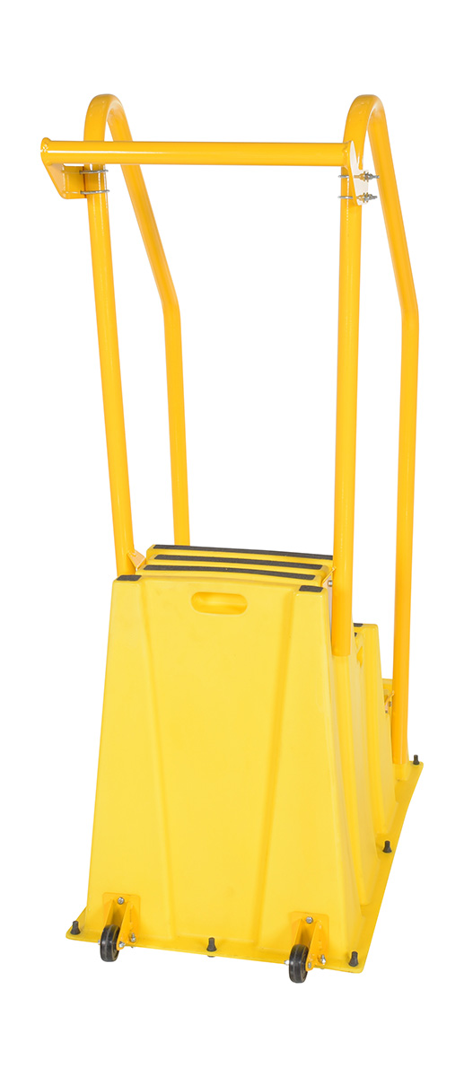 Polyethylene Nestable with Hand and Back Rails Casters 3 Step 500 Lb. Capacity YellowA poly step stool is a great asset for on the go or in a permanent setting. A lightweight design with front and side cutout handles, allow the user to easily transfer the stool to a preferred spot. The taped step surfaces ensure safe footing while traversing up and down the steps. Includes bolt on back rail, handrail, and casters. The hand rails height allows the unit to be pushed or pulled into the desired position, minimizing bending and twisting by the user. Steps can be nested to minimize footprint when not in use.