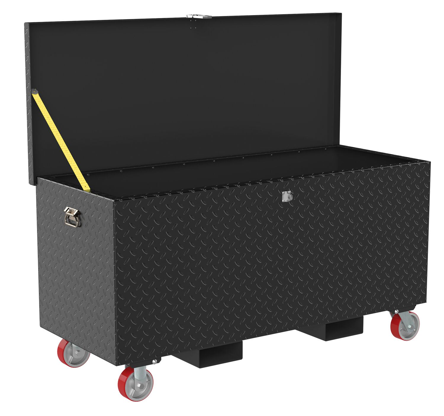 Steel Tread Plate Toolbox with Casters and Fork Pockets 24 In. x 60 In. 3,000 Lb. Capacity BlackSecure your tools and belongings with a steel tread plate storage box. With a steel construction, outside damage to stored objects is minimized. A centrally located hinged safety hasp makes it simple to secure the box with a padlock (padlock is not included). A handle is attached to each end of the box for easier lifting and maneuvering. Powder coat finish for baked in added toughness. This unit includes casters and fork pockets are attached to the base of the unit for portability between areas.
