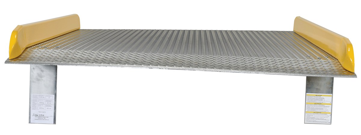 Aluminum Dock Board Steel Curb 60 In. x 72 In. 10,000 Lb. Capacity SilverThe Aluminum truck dock board with steel safety curbs is designed for portability and safety. The deck is made of tough high strength aluminum tread plate. The edges are beveled for smooth entry and exit. Safety curbs are coated yellow and are constructed of steel with cast tapered ends. Steel legs are bolted on for increased durability. Canted locking legs for easier truck portability. Manufactured in compliance with OSHA. The capacity is based upon the heaviest type of equipment used plus the maximum load carried times the single axle rating of total load. Dynamic loading, driver tendencies, speed and frequency of use must be considered. When using three-wheeled fork trucks order dock board with capacity at least four-times the lifting capacity of fork truck. The width of the dock board should be at least fifteen (15) inches wider than the load or equipment passing between the curbs. If the load does not pass between curbs, but is elevated above, add fifteen (15) inches to overall width of equipment.