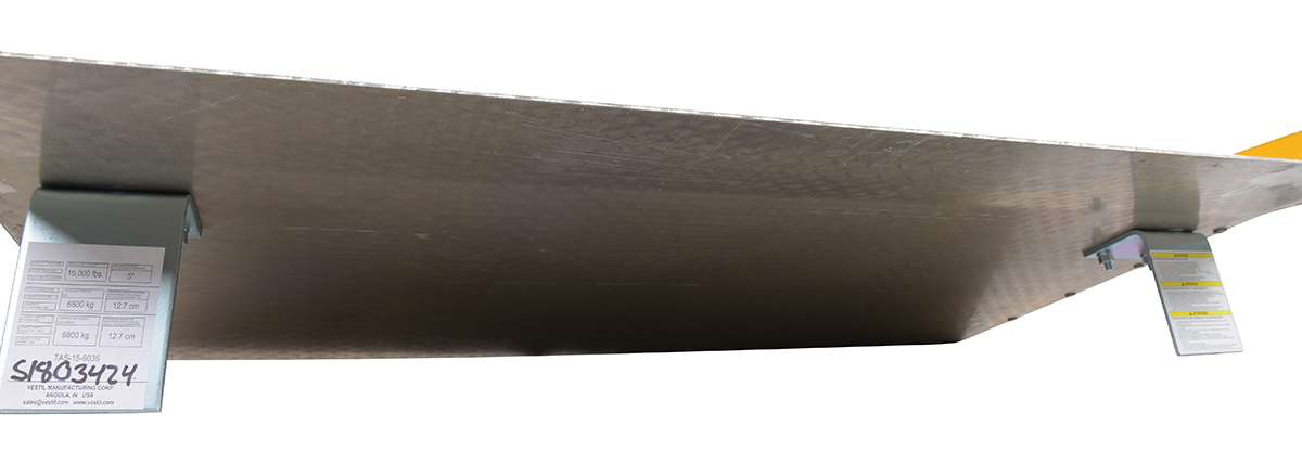 Aluminum Dock Board Steel Curb 60 In. x 36 In. 15,000 Lb. Capacity SilverThe Aluminum truck dock board with steel safety curbs is designed for portability and safety. The deck is made of tough high strength aluminum tread plate. The edges are beveled for smooth entry and exit. Safety curbs are coated yellow and are constructed of steel with cast tapered ends. Steel legs are bolted on for increased durability. Canted locking legs for easier truck portability. Manufactured in compliance with OSHA. The capacity is based upon the heaviest type of equipment used plus the maximum load carried times the single axle rating of total load. Dynamic loading, driver tendencies, speed and frequency of use must be considered. When using three-wheeled fork trucks order dock board with capacity at least four-times the lifting capacity of fork truck. The width of the dock board should be at least fifteen (15) inches wider than the load or equipment passing between the curbs. If the load does not pass between curbs, but is elevated above, add fifteen (15) inches to overall width of equipment.