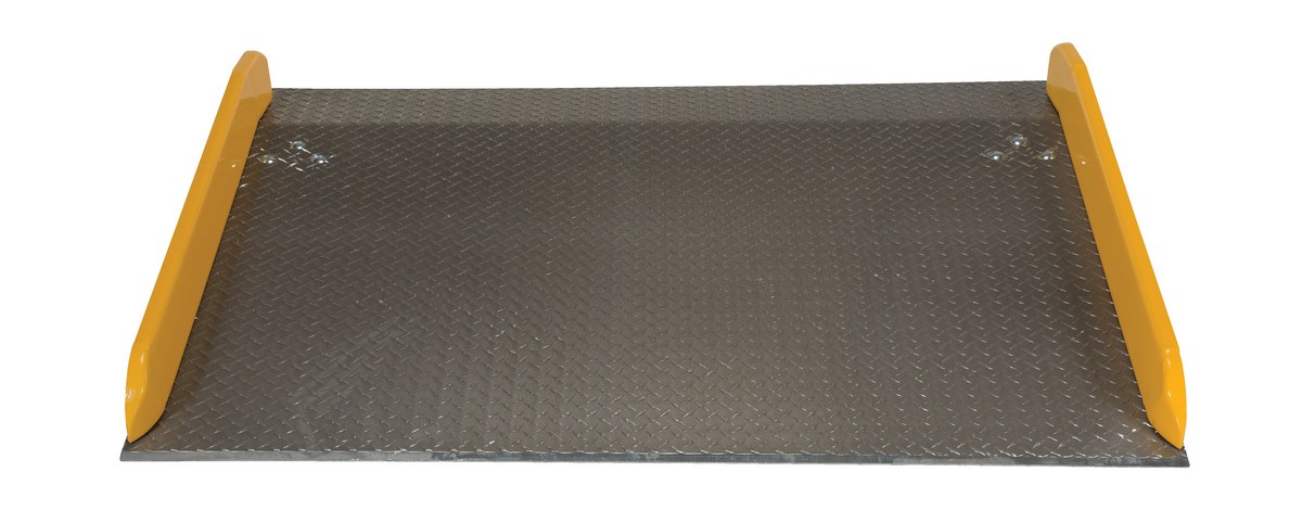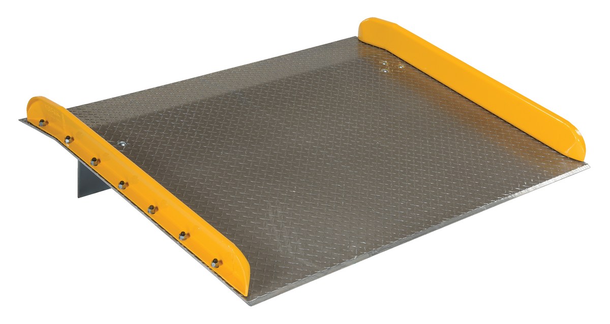Aluminum Dock Board Steel Curb 60 In. x 48 In. 15,000 Lb. Capacity SilverThe Aluminum truck dock board with steel safety curbs is designed for portability and safety. The deck is made of tough high strength aluminum tread plate. The edges are beveled for smooth entry and exit. Safety curbs are coated yellow and are constructed of steel with cast tapered ends. Steel legs are bolted on for increased durability. Canted locking legs for easier truck portability. Manufactured in compliance with OSHA. The capacity is based upon the heaviest type of equipment used plus the maximum load carried times the single axle rating of total load. Dynamic loading, driver tendencies, speed and frequency of use must be considered. When using three-wheeled fork trucks order dock board with capacity at least four-times the lifting capacity of fork truck. The width of the dock board should be at least fifteen (15) inches wider than the load or equipment passing between the curbs. If the load does not pass between curbs, but is elevated above, add fifteen (15) inches to overall width of equipment.