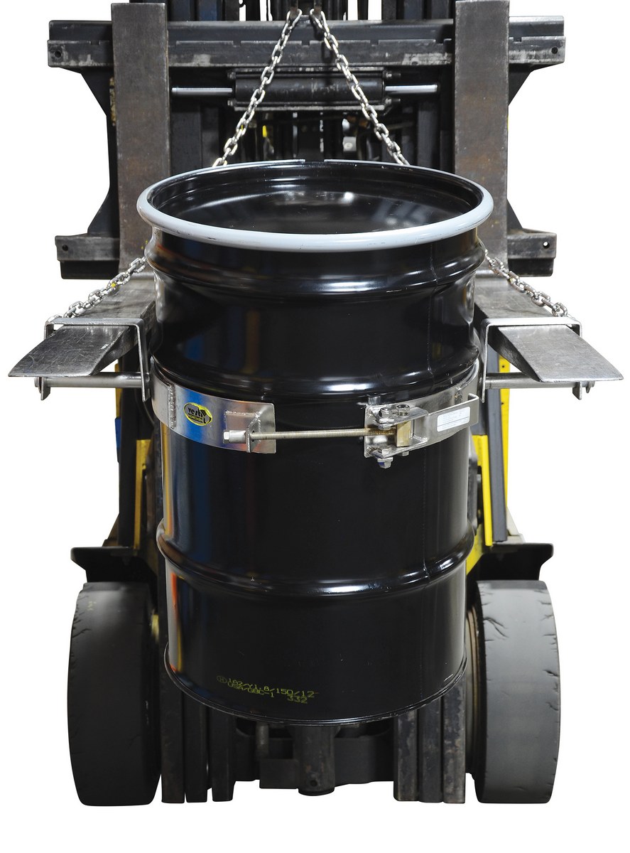 Easily transport steel drums with your fork truck and the tilting drum ring. Pivoting fork pockets allow you to manually rotate drum to dispense light materials. To use, slip the band over the belly of the steel drum and tighten the lock to secure the band around the belly of the drum. Welded steel construction.