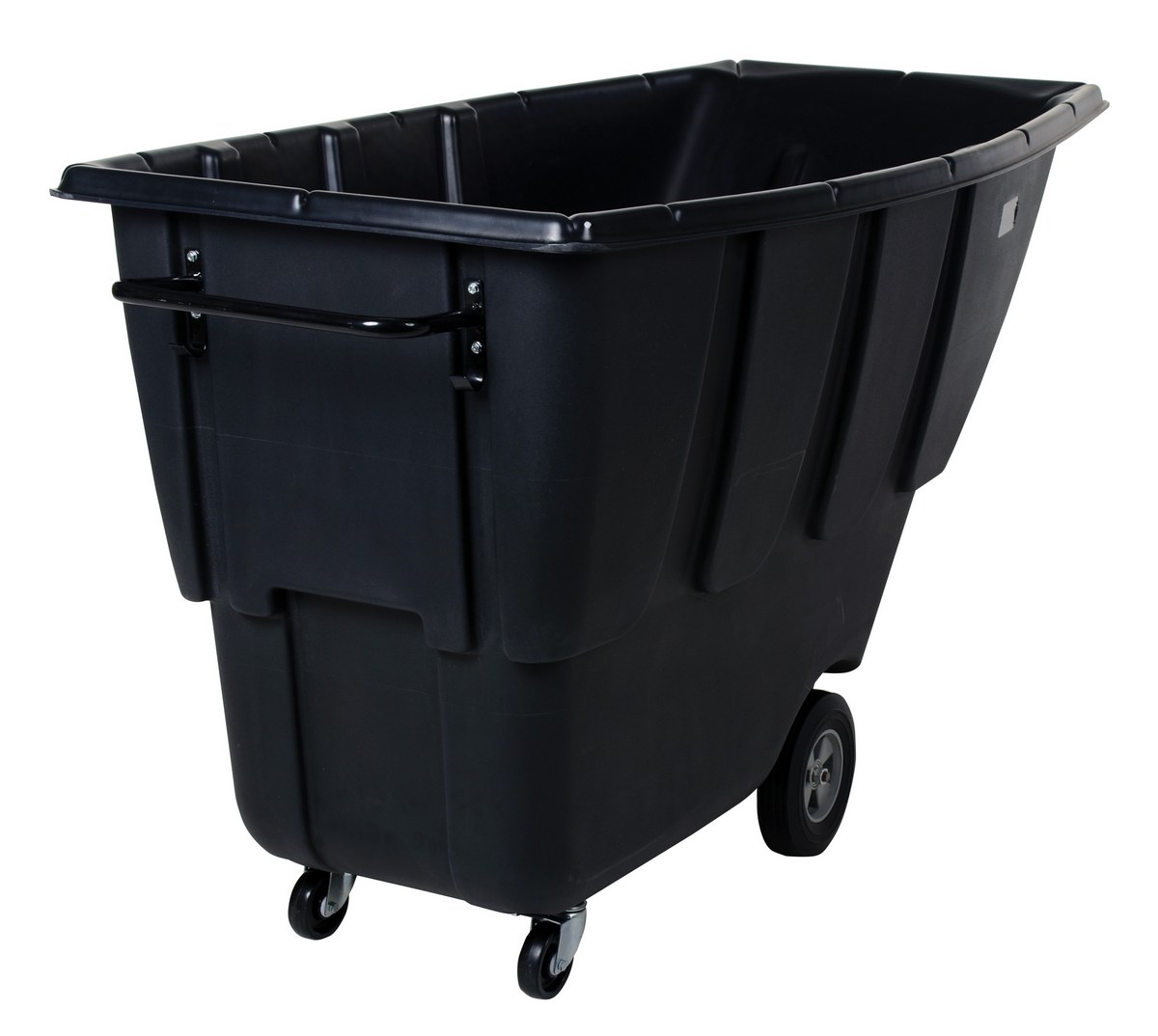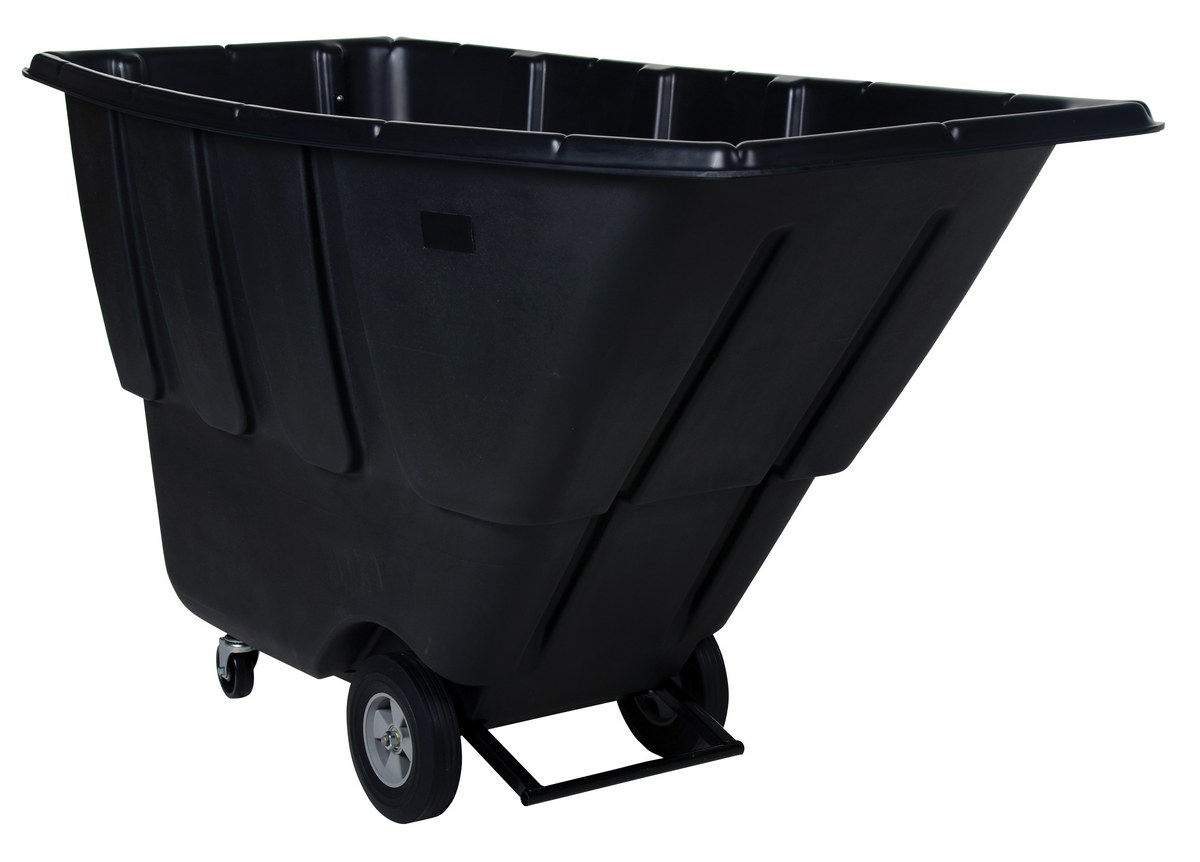 Plastic Medium Duty Tilt Truck 1 Cubic Yard 1250 Lb. Capacity BlackDurable plastic construction allows for collecting waste from multiple bins at a collective time. Great for warehouses, fairs, ball parks, schools, etc. Strong, one-piece molded polyethylene body with steel base tip support and a balanced design to allow for simple dumping by one person. Easily portable on 2 large rubber wheels and two swivel wheels. Not for use with fork trucks. Black color design.