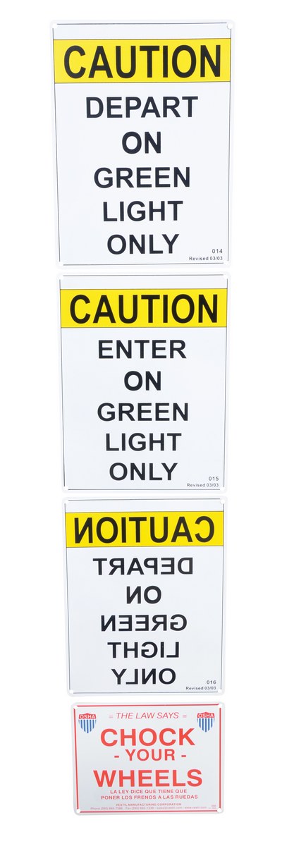 The trailer lock system is designed for installation directly in front of the loading dock. The electric hydraulic system captures the ICC bar on the back of semi-trailers. To ensure maximum safety the unit comes standard with an accumulator that allows the lock to follow the trailer up and down as it is loaded/unloaded. A beeper and flashing light warns the operator if the lock does not engage the trailer properly. A visual indication of the restraint's status is shown at all times by the traffic light outside and the control panel inside. It comes standard with light package, control panel, three (3) large visual signs, and LED bulbs.