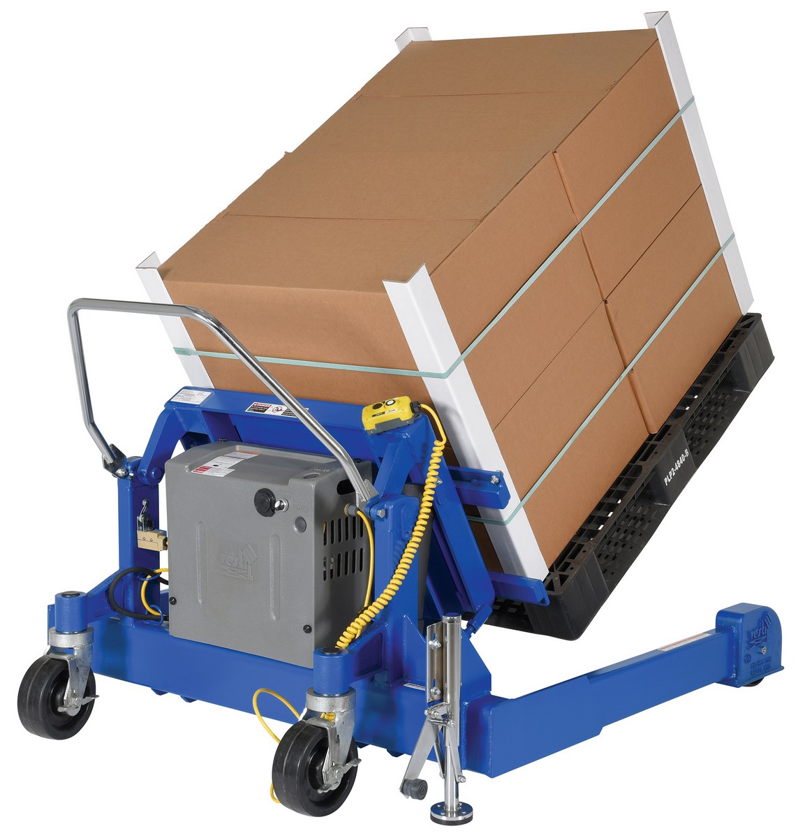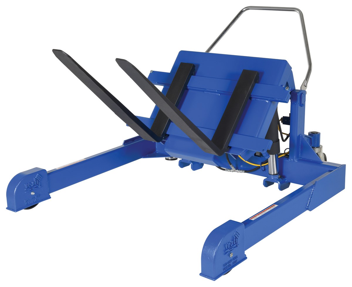 Steel Tilt Master Straddle DC Powered 12 Volt 4,000 Lb. Capacity BlueThe tilt master straddle lifts and positions filled tote boxes or baskets without the need of a fork truck or lift table using the newly designed heavy-duty tilt master. The tilter will function as transporters by moving completed products from work station to work station without waiting for a fork truck. This lift has a thin profile to allow the user to get as close to the load as possible. It also has a standard floor lock and rolls easily on the phenolic steering wheels. Lift is designed to be used with virtually any kind of container or pallet. The unit is powered by a DC electric motor that includes an on-board battery charger and battery charge indicator.