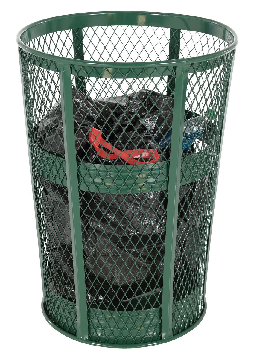 Steel Trash Receptacle Round 48 Gallon GreenThe expanded metal trash cans are perfect for a variety of settings. The mesh style metal design allows for the amount level to be determined easier and allow for an easier cleanup. The strong, yet lightweight, construction withstands adverse conditions on a consistent basis and be moved easily without the need of extra personnel when empty. Available in a variation of colors.