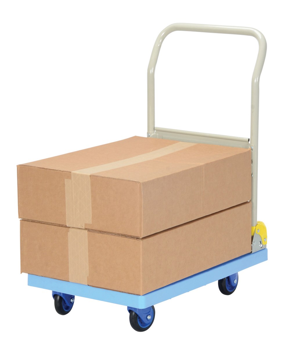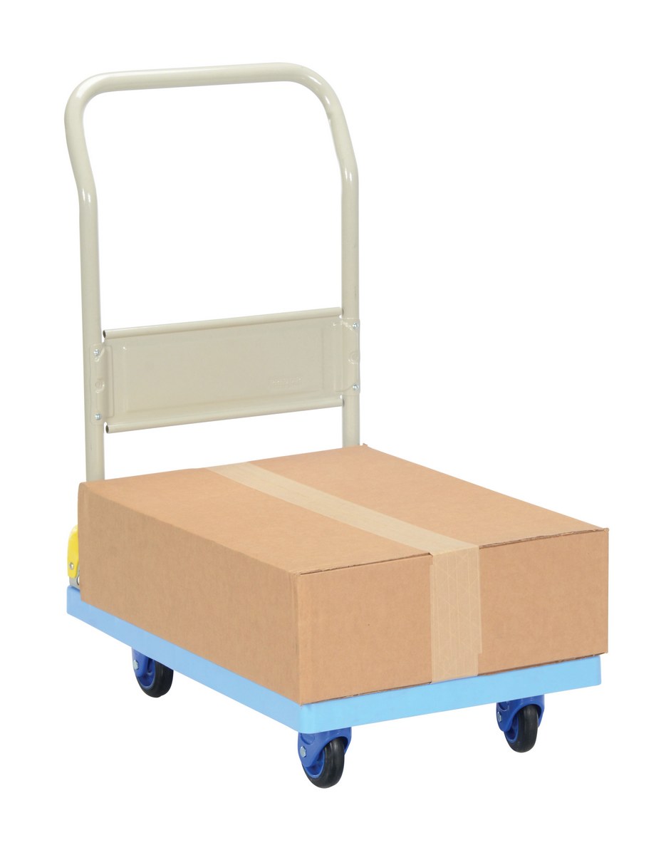 Plastic Truck Folding Handle 27-7/8 In. x 17-7/8 In. x 34 In. 330 Lb. Capacity BlueThe plastic platform cart is a great addition to the shipping and distributing facilities. The plastic platform creates a durable, yet lightweight construction that can be transferred simply from workstation to workstation. The unit rolls on casters for smooth transference over a variety of terrains. The attached handle creates a more ergonomic posture of personnel during use.