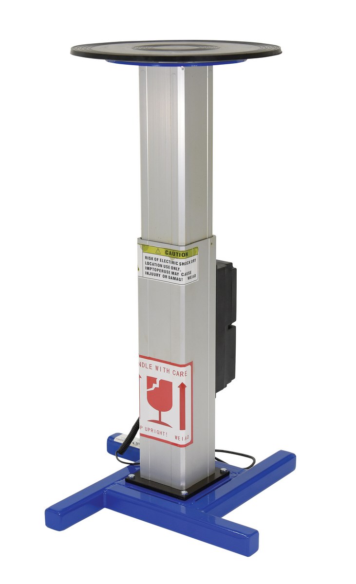 Steel Turntable 18 In. Diameter DC Powered 27-43 In. Height Adjustment 24V 750 Lb. Capacity BlueThe turntable with powered height adjustment allows the operator to raise or lower turntable to an ergonomic height. This unit has a manual turntable and is DC powered with hand control for height adjustment. Hand held pendant control connects to power unit with a coil cord. Height is adjusted with an electric linear-actuator.