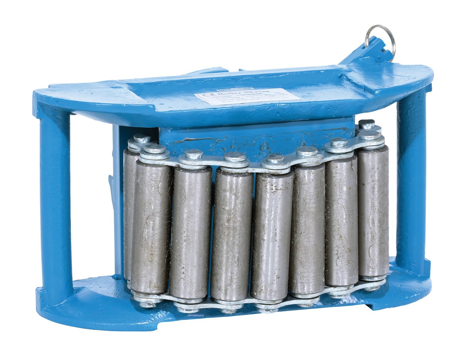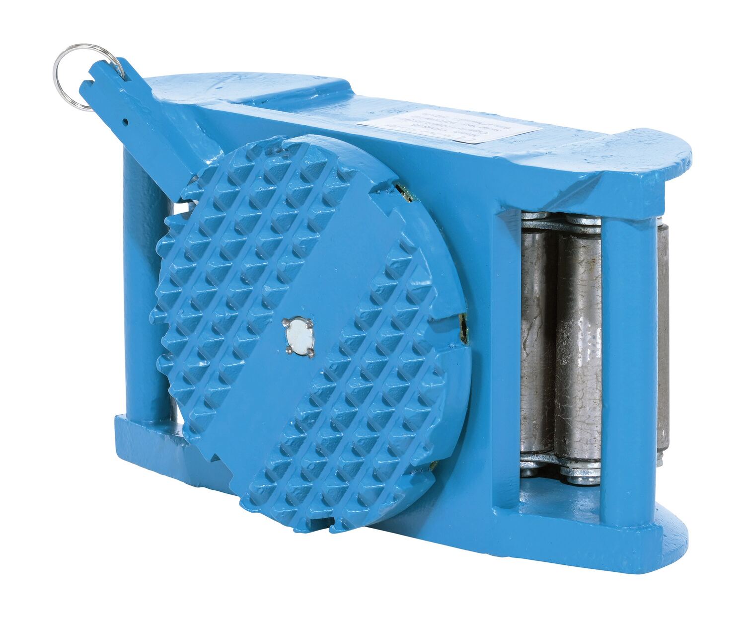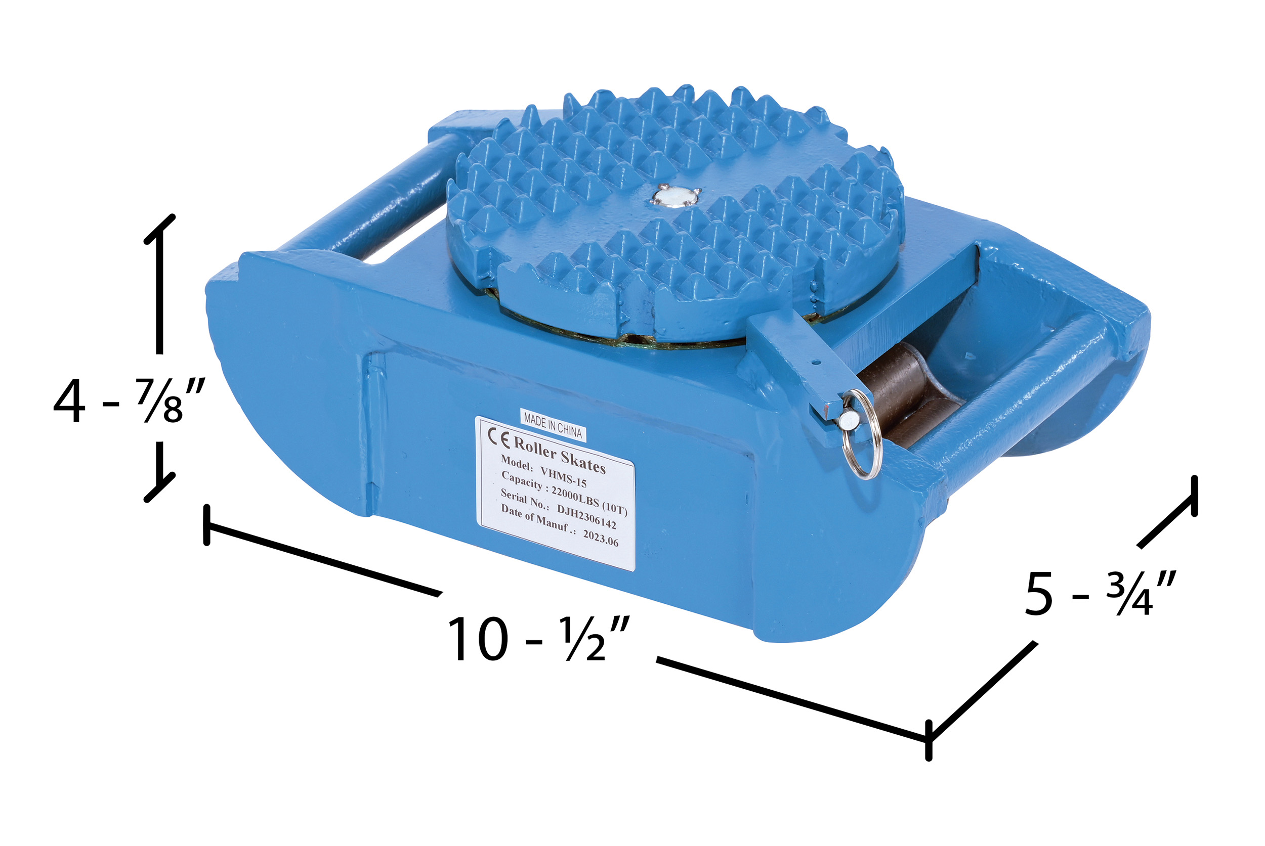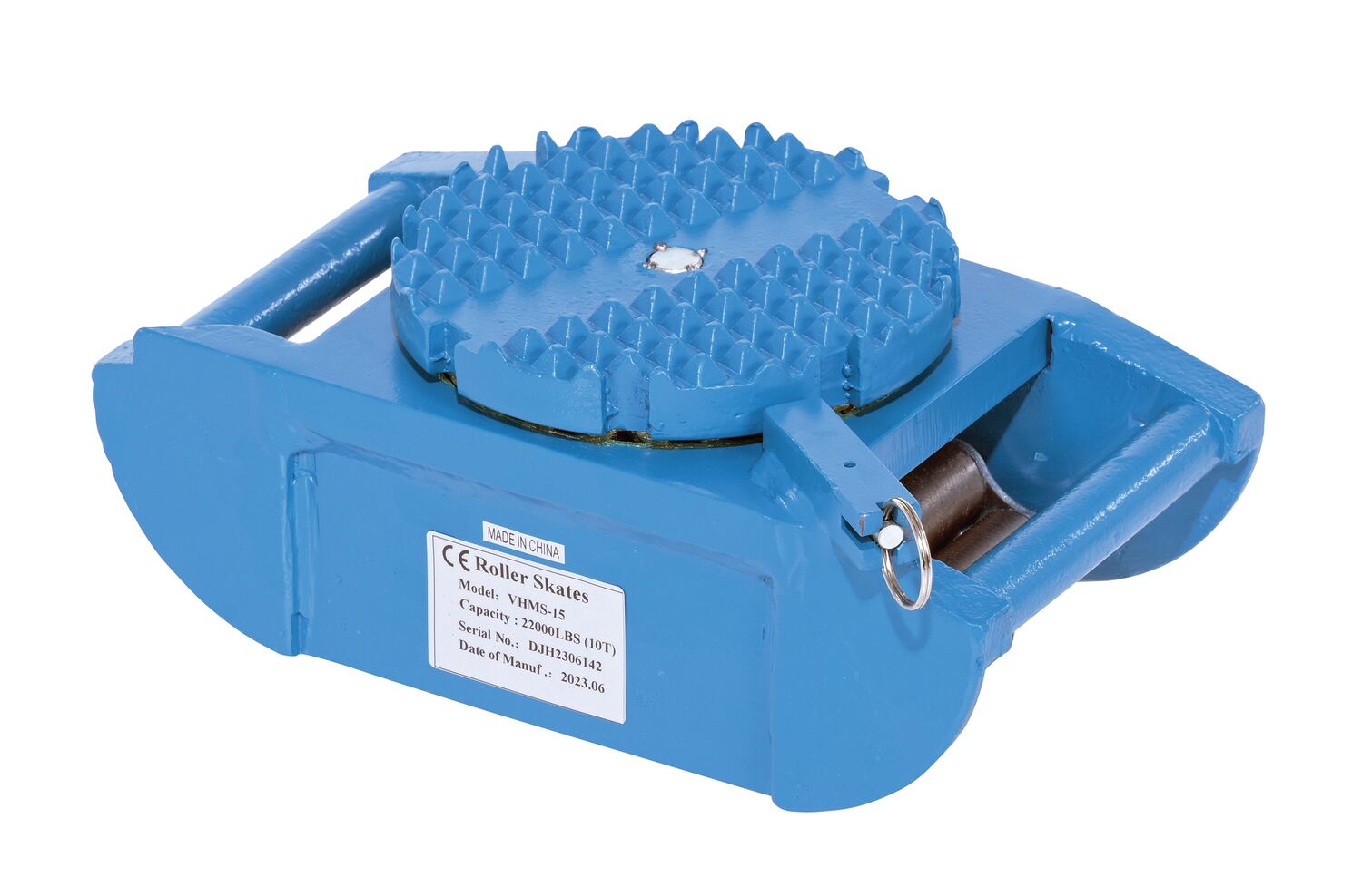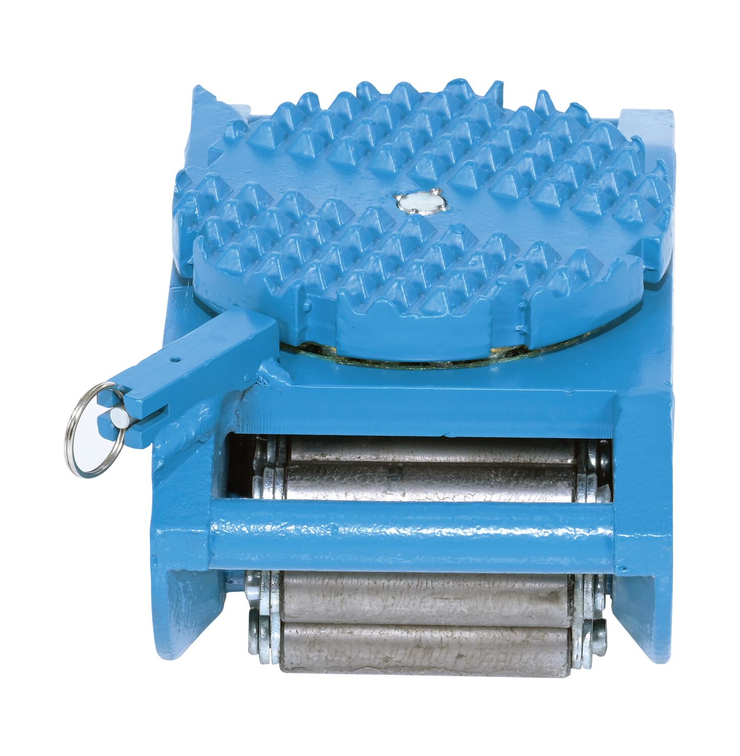 Steel Machine Roller 22,000 Lb. Capacity BlueMade of high-strength annealed ductile iron, this steel machine roller has swivel tops that rotate three hundred sixty degrees (360 degrees) on chrome steel ball bearings to allow for easier turning. The rollers form a "tank track" to revolve around a center load bearing plate in the frame to provide maximum maneuverability. The weight of the load is transferred directly from the load bearing plate to the rollers, eliminating axle friction and requiring less power to start and move. This unit is virtually maintenance free.