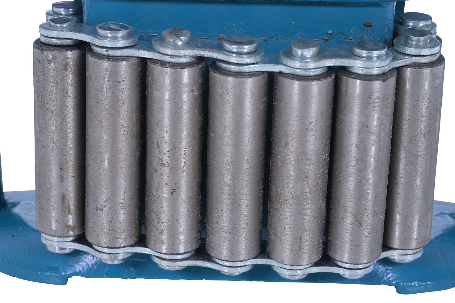 Steel Machine Roller 8,250 Lb. Capacity BlueMade of high-strength annealed ductile iron, this steel machine roller has swivel tops that rotate three hundred sixty degrees (360 degrees) on chrome steel ball bearings to allow for easier turning. The rollers form a "tank track" to revolve around a center load bearing plate in the frame to provide maximum maneuverability. The weight of the load is transferred directly from the load bearing plate to the rollers, eliminating axle friction and requiring less power to start and move. This unit is virtually maintenance free.