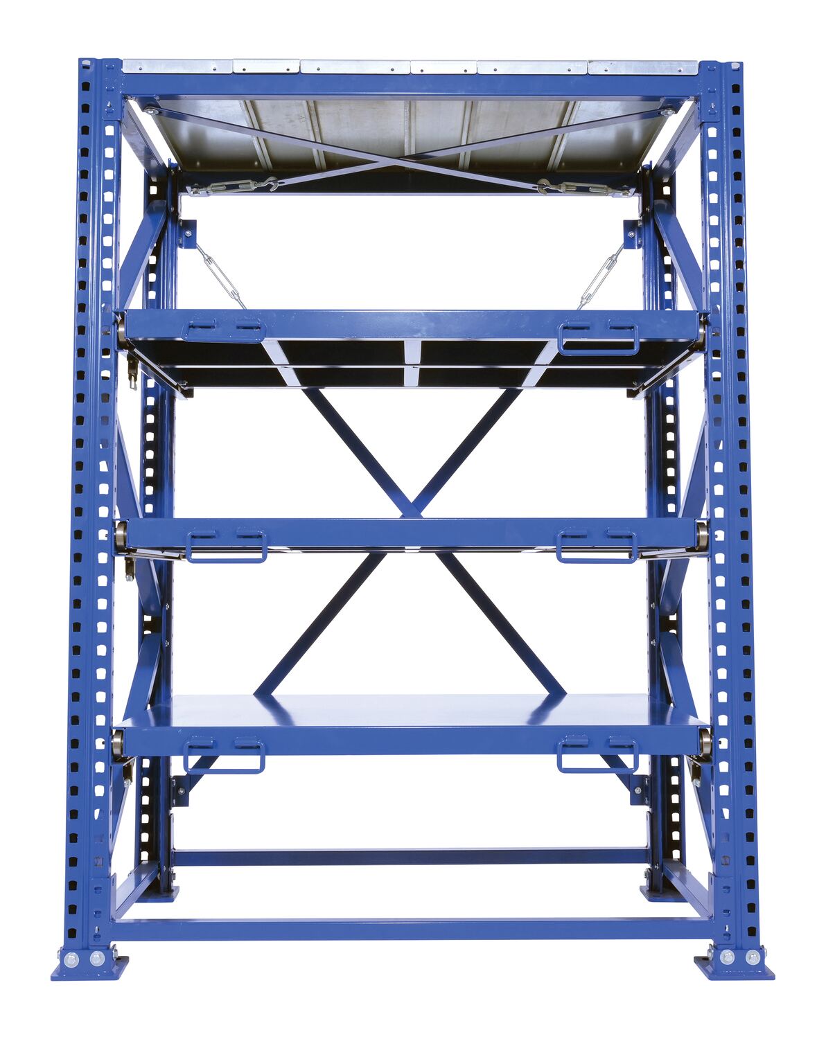 Steel Heavy Duty Roll-Out Shelving 32L X 60W X 80H 3,000 Lb. Capacity BlueHeavy Duty roll-out shelving supports and stores heavy dies, fixtures and machinery. Shelves should be rolled out one at a time for simple product placement, as well as, personnel safety. All steel construction with powder coat finish. Mounting holes are pre drilled. Assembly hardware is included. Mounting hardware is available separately.