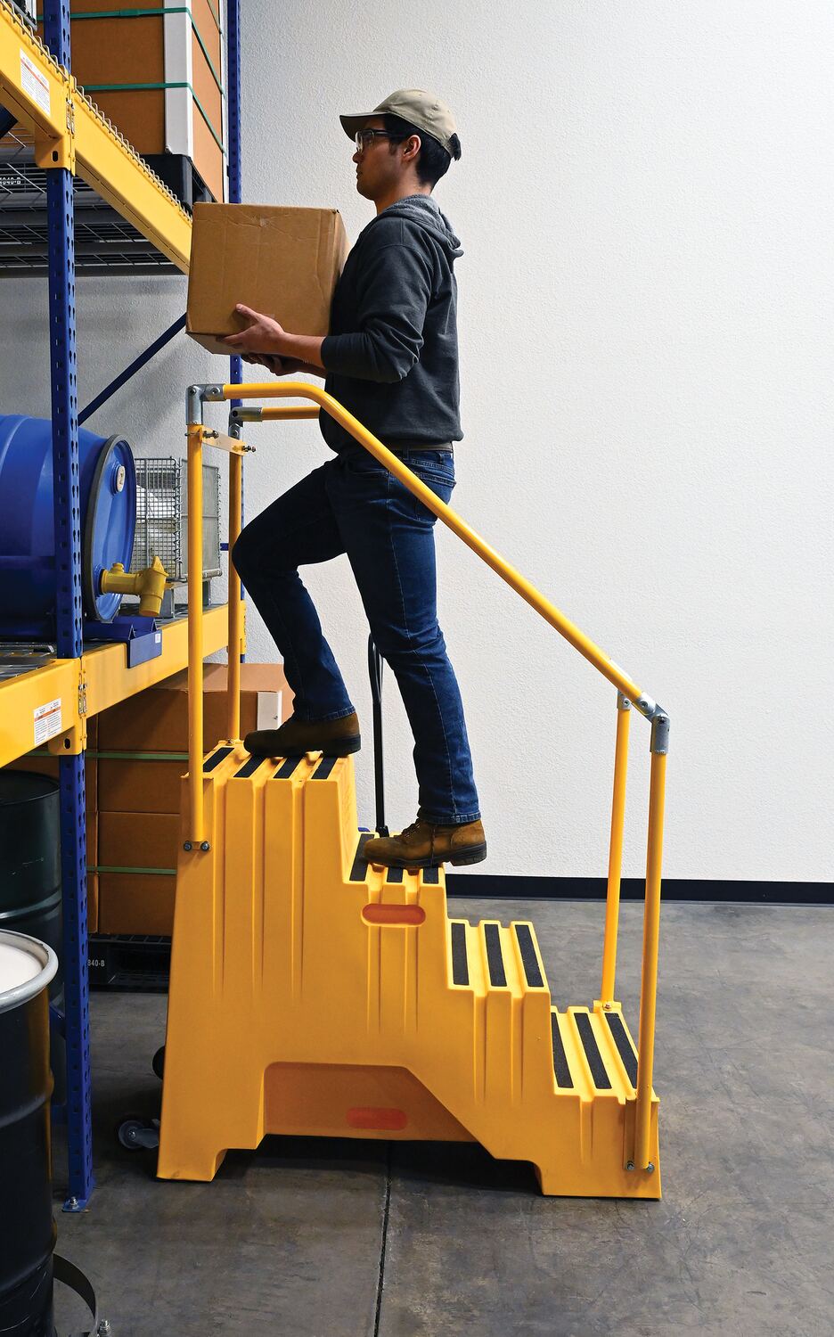 When items are out of reach, do not strain, simply step up with this Polyethylene step stool. The four (4) step unit has rear opening access storage compartments. This stool has rubber feet and a non-skid tape surface. Hand holes are standard for easy one person transportation.