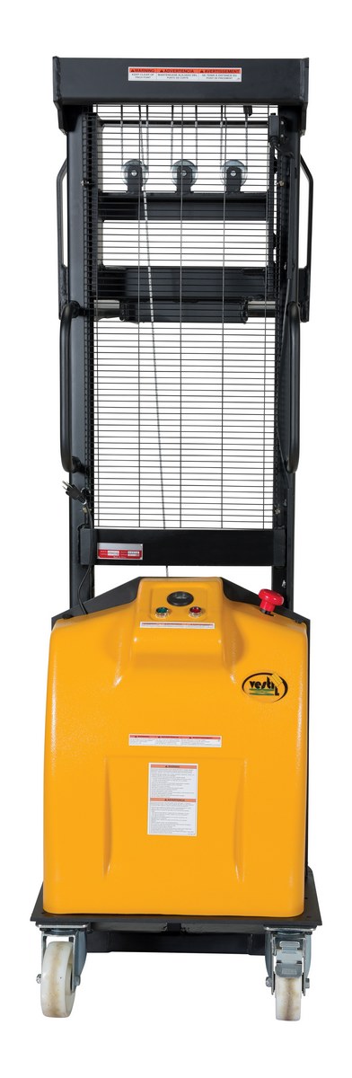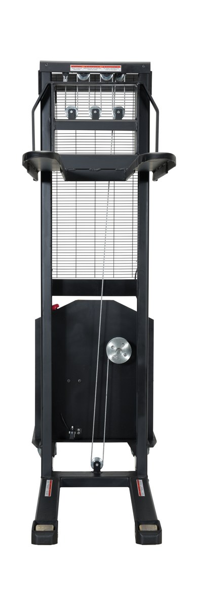 Steel Stacker with Fixed DC Powered Winch 770 Lb. Capacity Black / YellowThe electric winch stacker features a heavy duty mast and a DC winch for easier and safer lifting. Lift and lower by DC winch and steel cable mechanism. A full height push-handle is included for easy steering and excellent visibility through welded mesh guard. The unit rolls smoothly on two rigid and two swivel wheels with brakes for easy maneuvering.