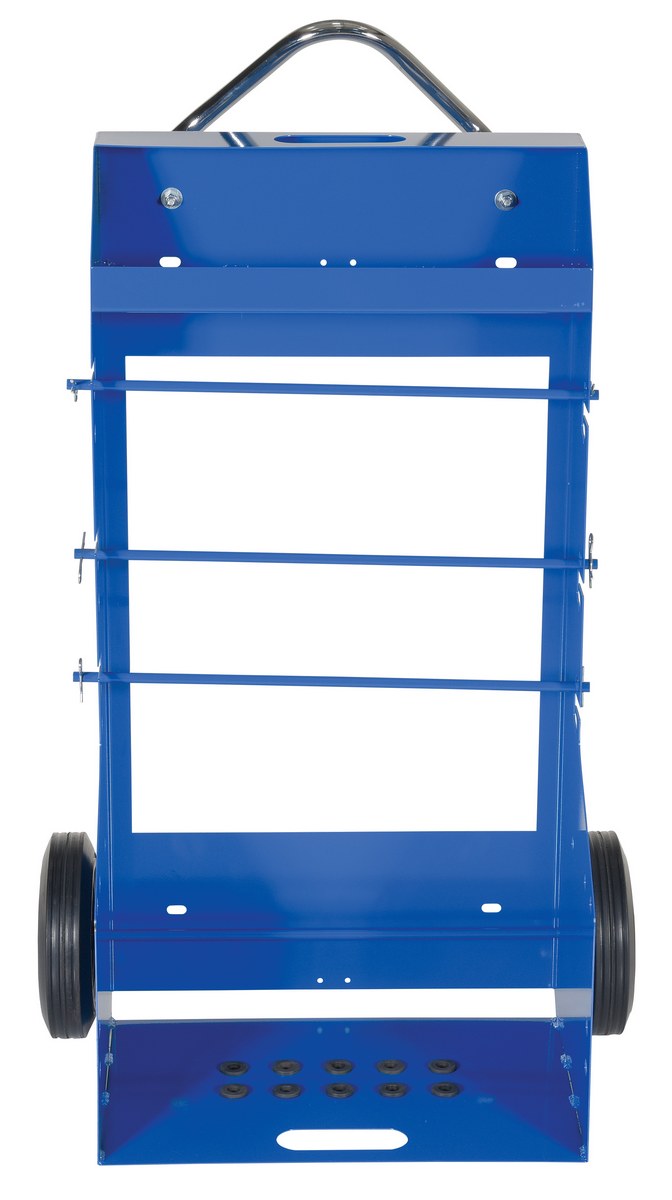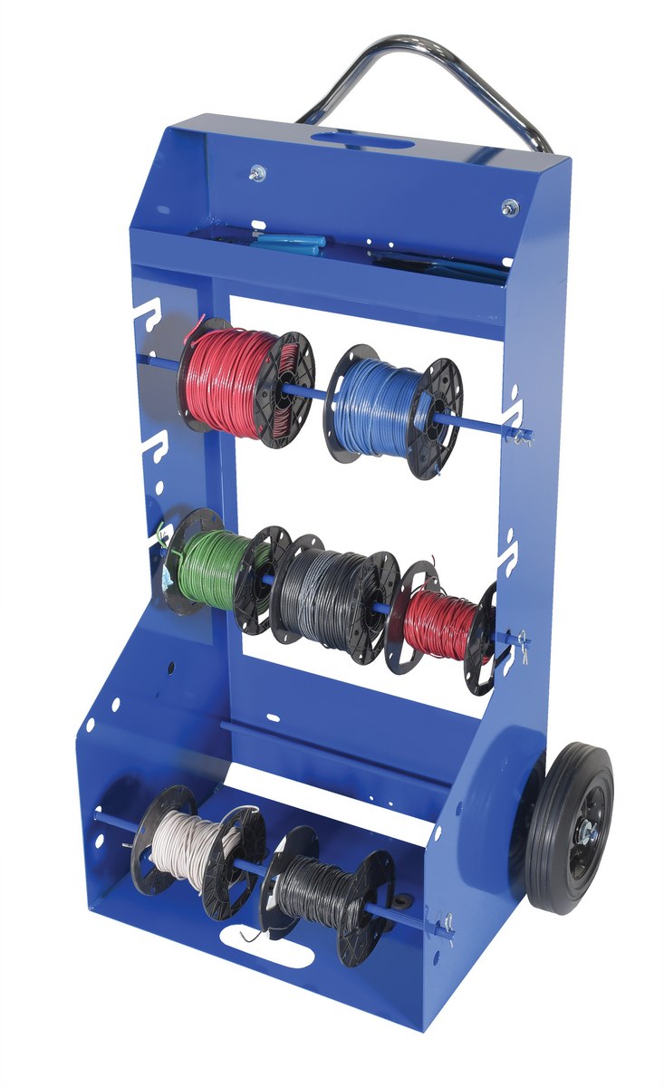 Portable Steel Cord Reel Caddy 300 Lb. Capacity BlueThis portable wire reel caddy is designed to easily move wire reels where you need them the most. Dispense wire in vertical or horizontal position. Includes four (4) spool bars for handling various size reels. Bottom of caddy includes wire guide holes for quick access. Bolt-on push handle and casters for smooth ergonomic transporting.