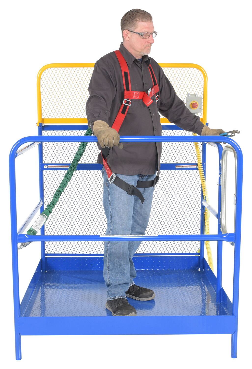 Steel Full Featured Work Platform 48 In. x 48 In. 1,000 Lb. Capacity BlueThis convenient fork truck work platform quickly and safely raises maintenance personnel where they are needed. Attaches to fork truck by inserting forks into fork pockets and securing platform to fork truck. Fork locks secure platform to forks. Dual handrails on three (3) sides with expanded metal backing on the fourth side. Includes checker floor plate platform and long strap with hook to attach platform to fork truck. A maximum of two (2) people can be in the work platform at one time. The full featured units include an emergency stop button kit and web lanyard with XL safety harness. Alternate size harnesses available upon request, S-XL (XXL & XXXL available at an additional charge).